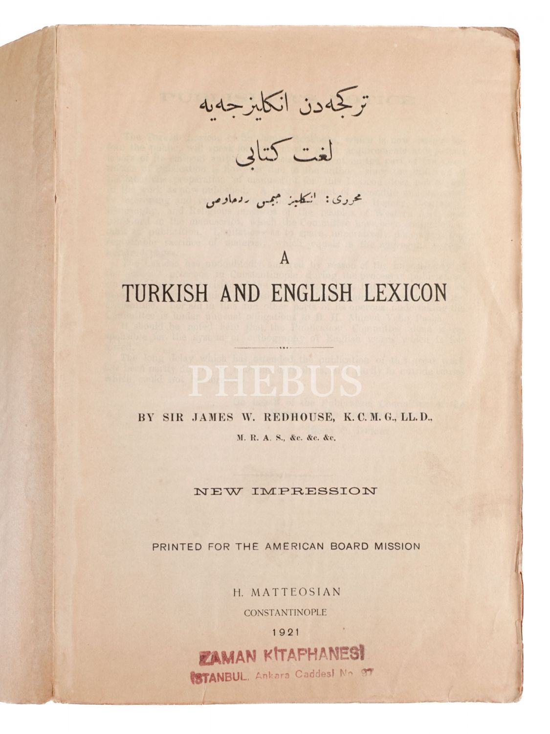 TÜRKÇE´DEN İNGİLİZCE´YE LUGAT KİTABI (A TURKISH AND ENGLISH LEXICON), James W. Redhouse, 1921, H. Matteosian Matbaası, 2224 sayfa, 17x25 cm...