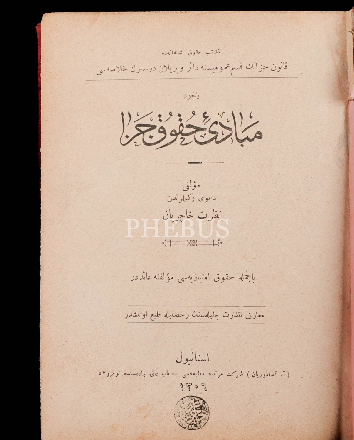 MEBADİ-İ HUKUK CEZA, Nazarat Haçeryan, 1306, A. Asaduryan Şirket-i Mürettibiye Matbaası, 232 sayfa, 14x18 cm...