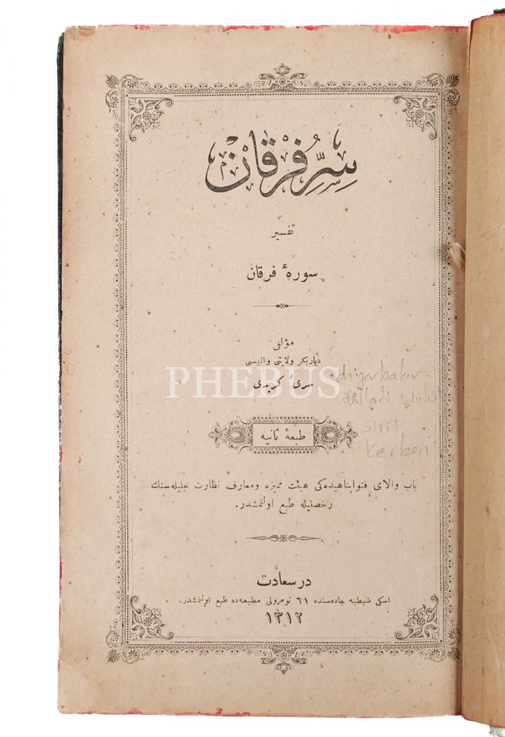 SIRR-I FURKAN (Tefsir-i Sure-i Furkan) Giridî Sırrı Paşa, 1312, Eski Zabtiye Cadddesi´nde 61 Numaralı Matbaa, 320 sayfa, 14x22 cm...