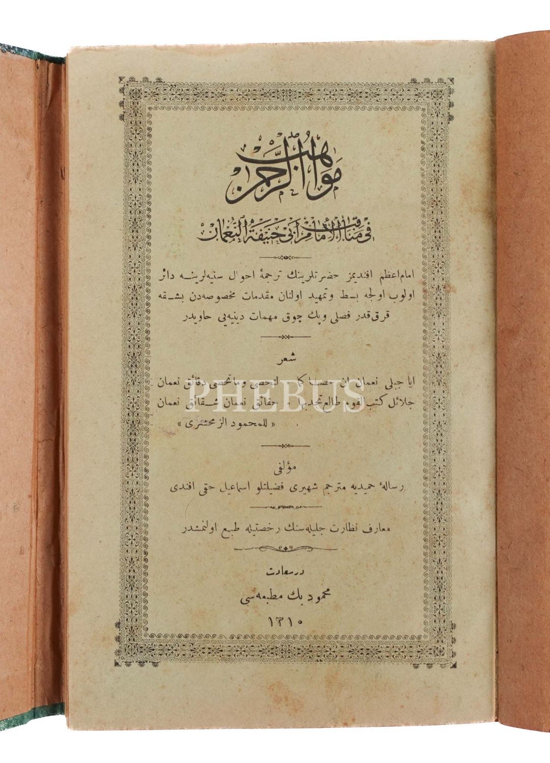 MEVAHİBÜ´R-RAHMAN Fİ MENAKIBİ´L-İMAM EBU HANİFETE´L-NUMAN, Ahmed b. Muhammed ibn-i Hacer, (çeviren: Manastırlı İsmail Hakkı ), 1310, Mahmud Bey Matbaası, 214 sayfa, 16x23 cm...