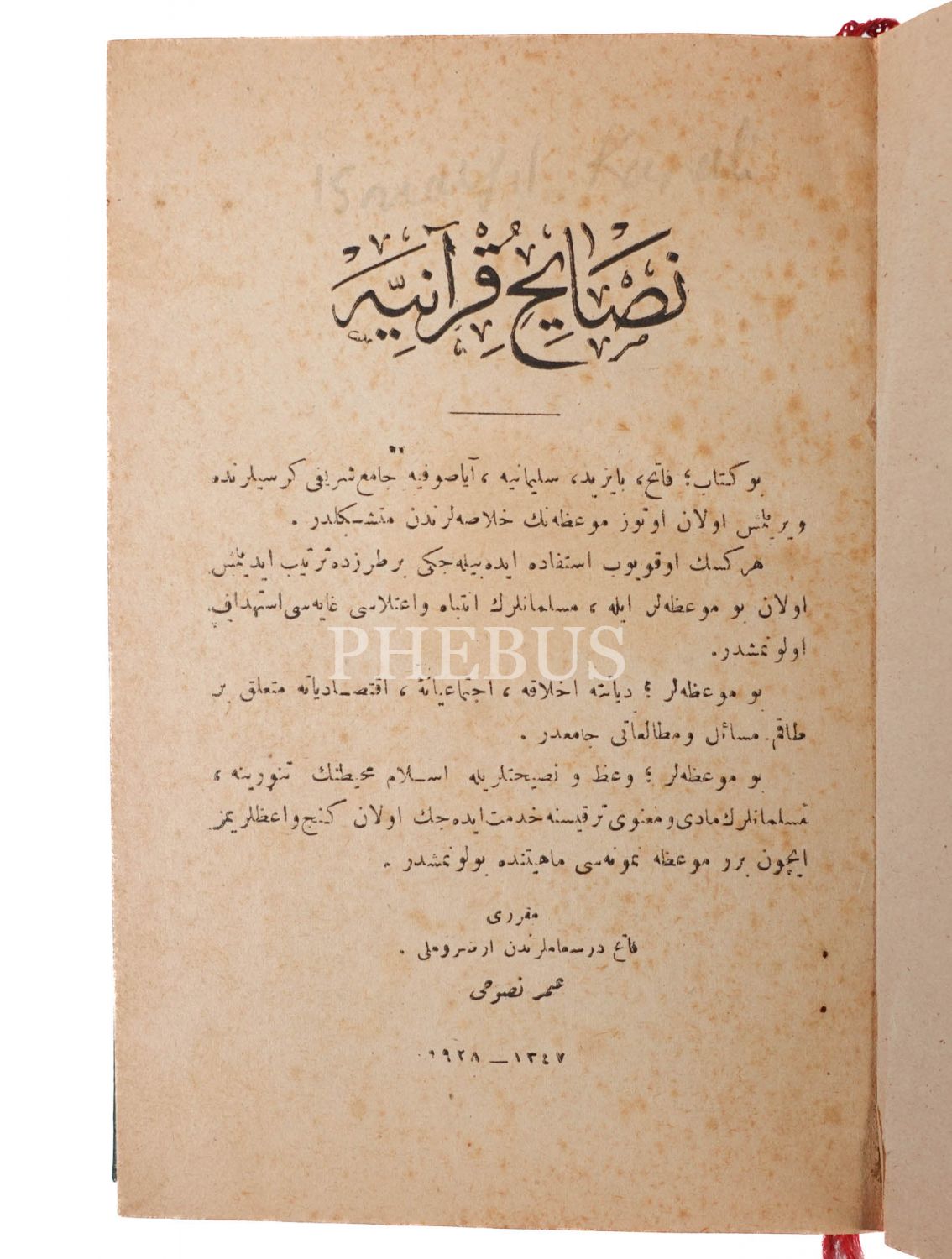 NASAYİH-İ KUR´ANİYE, Erzurumlu Ömer Nasuhi [Bilmen], 1928, Ahmed Kâmil ve Şeriki Matbaası, 240 sayfa, 14x20 cm...