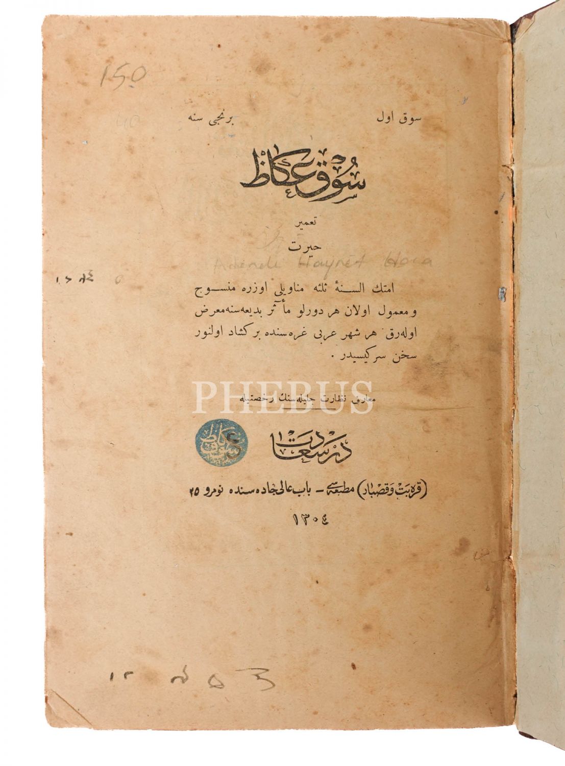 SÛK-İ UKKAZ, Adanalı Hayret Hoca, 1304, Karabet ve Kasbar Matbaası, 115 sayfa, 15x22 cm...