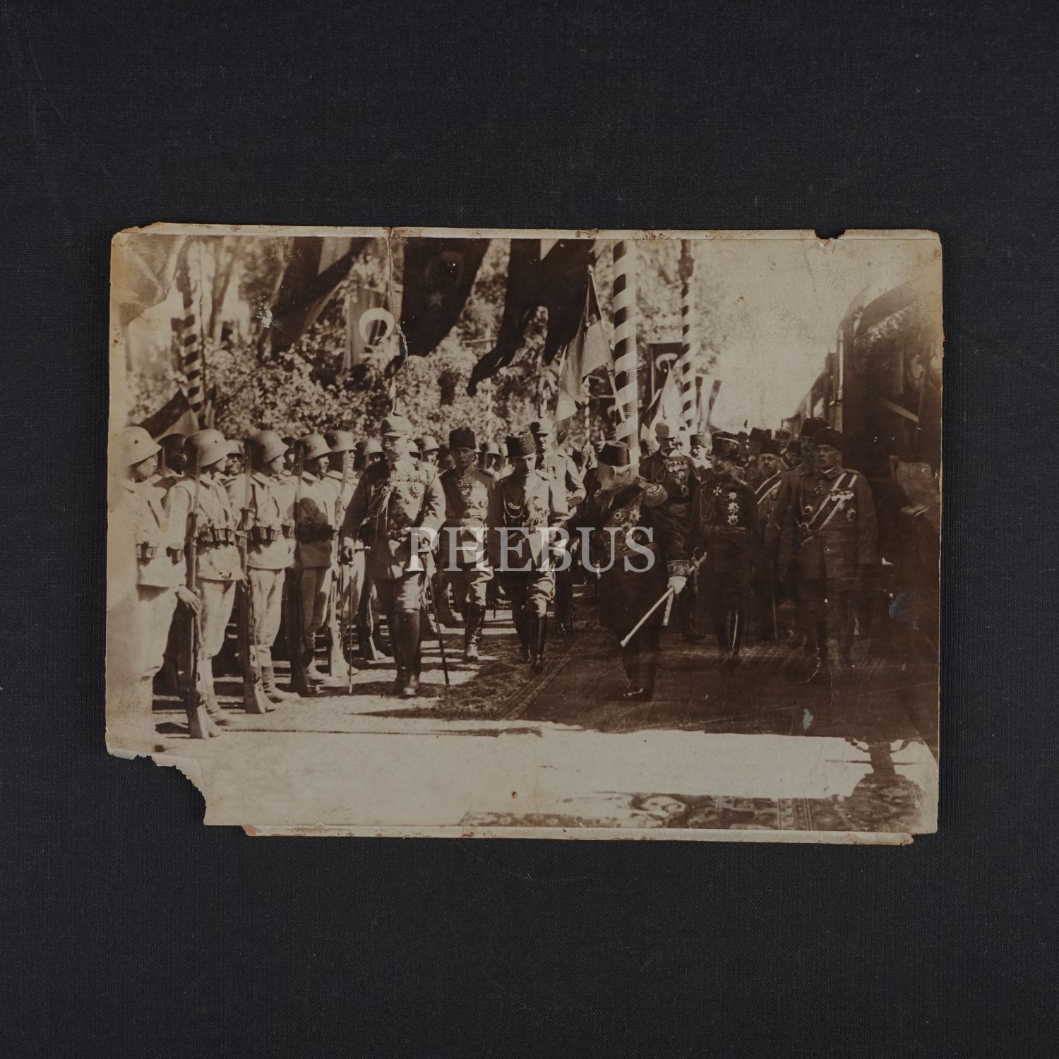 Sultan Mehmed Reşad, Kayzer Wilhelm, Harbiye Nazırı Enver Paşa ve Cihan Harbi´nde kader birliği yapan iki dost ülkenin önde gelen devlet adamları, Sirkeci Tren İstasyonu´nda düzenlenen karşılama töreninde, 1917, 28x21 cm...