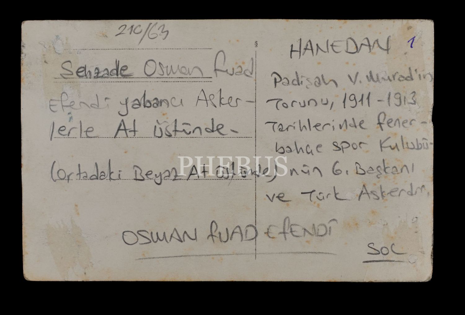 Şehzade Osman Fuad Efendi, maiyeti ve yabancı askerlerle birlikte at üstünde, 14x9 cm...