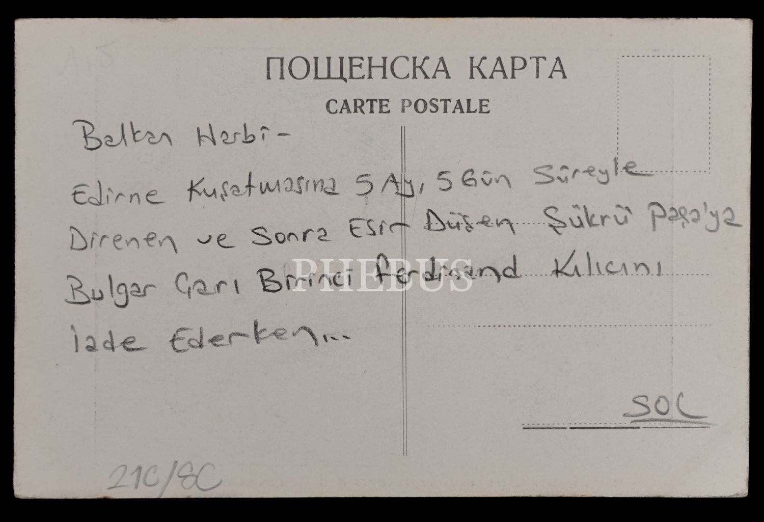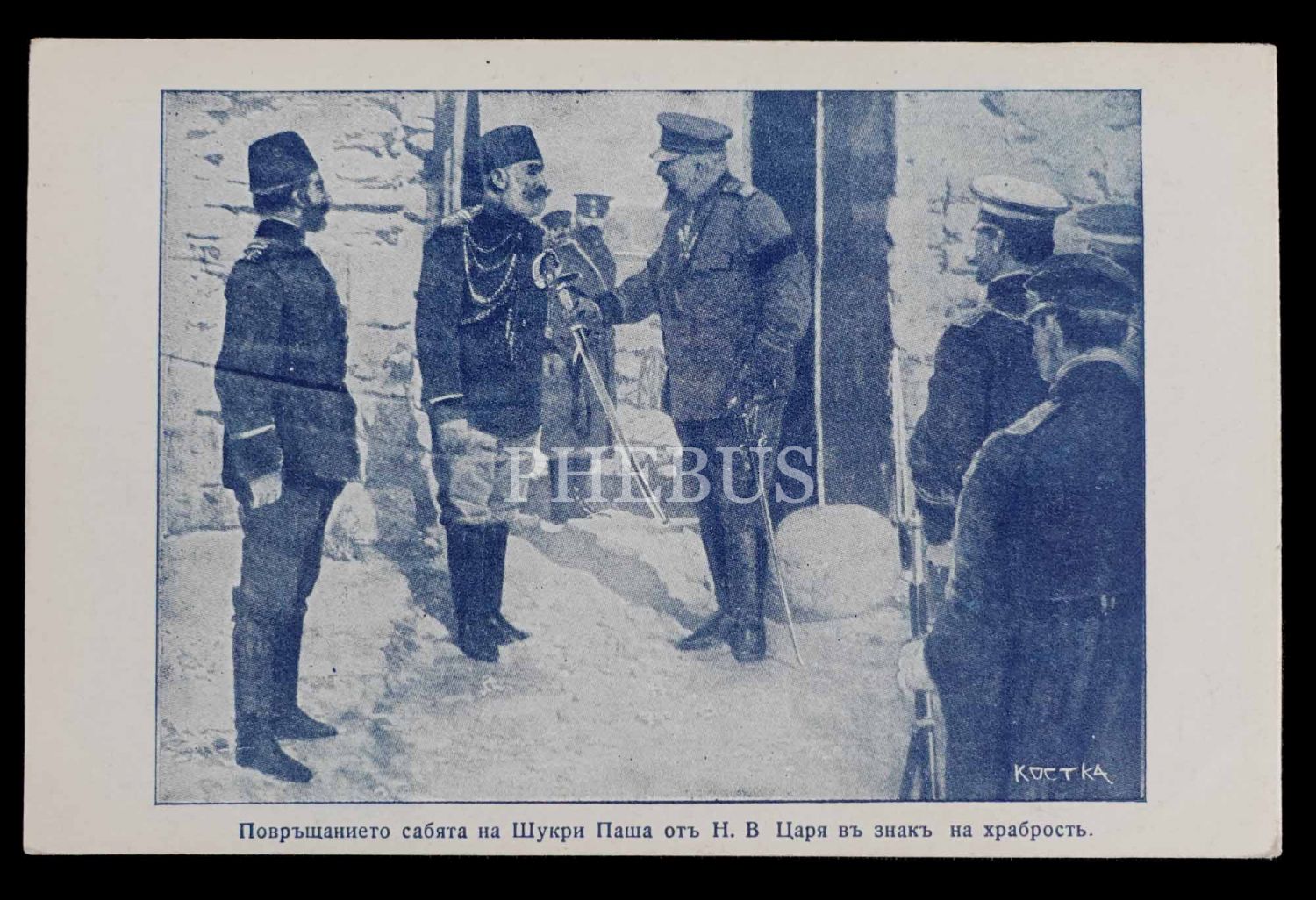 Edirne Kuşatması´na karşı 5 ay, 5 gün kahramanca direndikten sonra Bulgarlara esir düşen Mehmed Şükrü Paşa, Bulgar Çarı I. Ferdinand tarafından bir saygı nişanesi olarak kendisine iade edilen kılıcını teslim alırken, 14x9 cm...