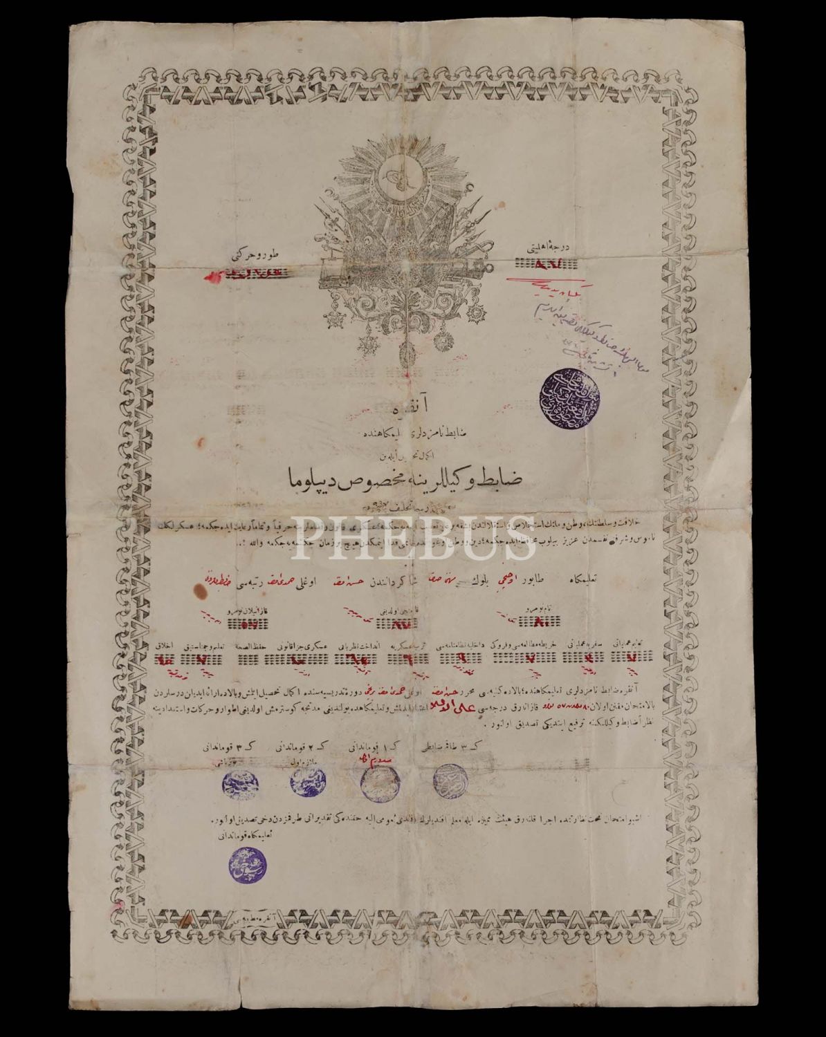 Ravza-i Terakki Rüşdiye Mektebi öğrencilerinden Şerafettin Bey´e verilen, Sultan İkinci Abdülhamid tuğralı tahsin varakası, 13x14 cm...