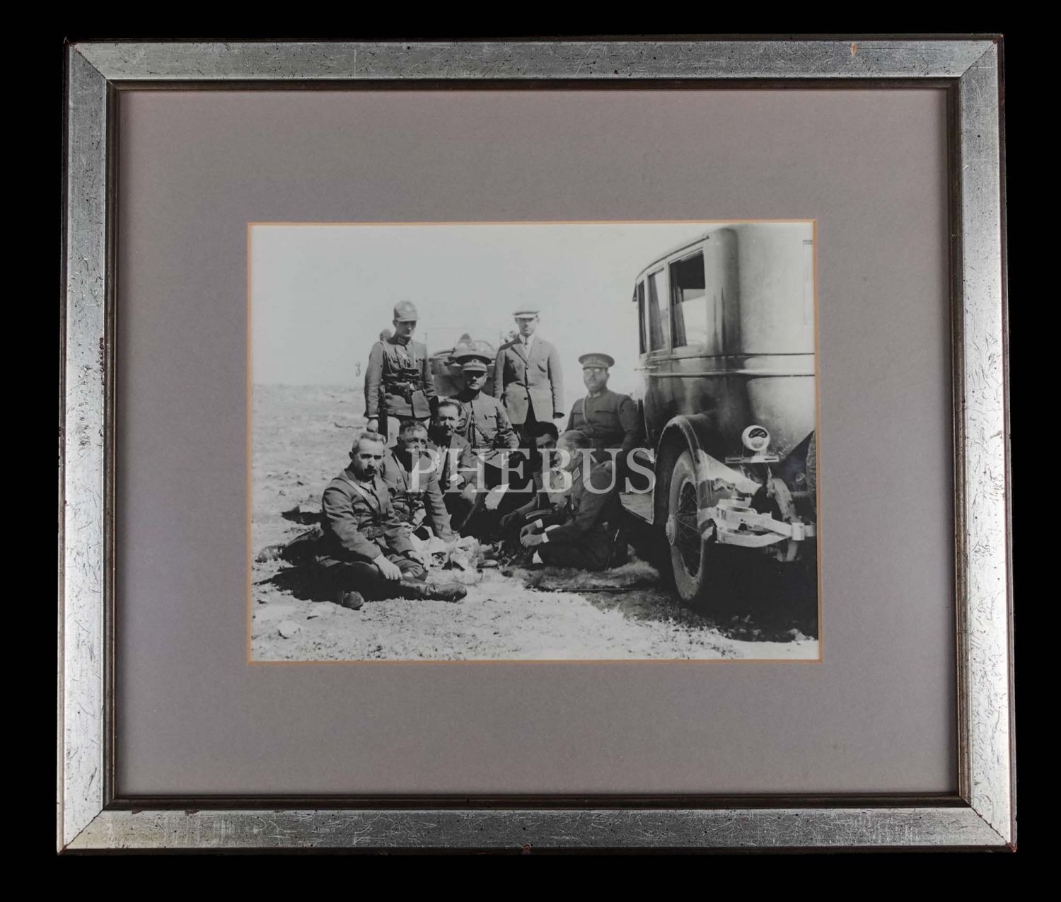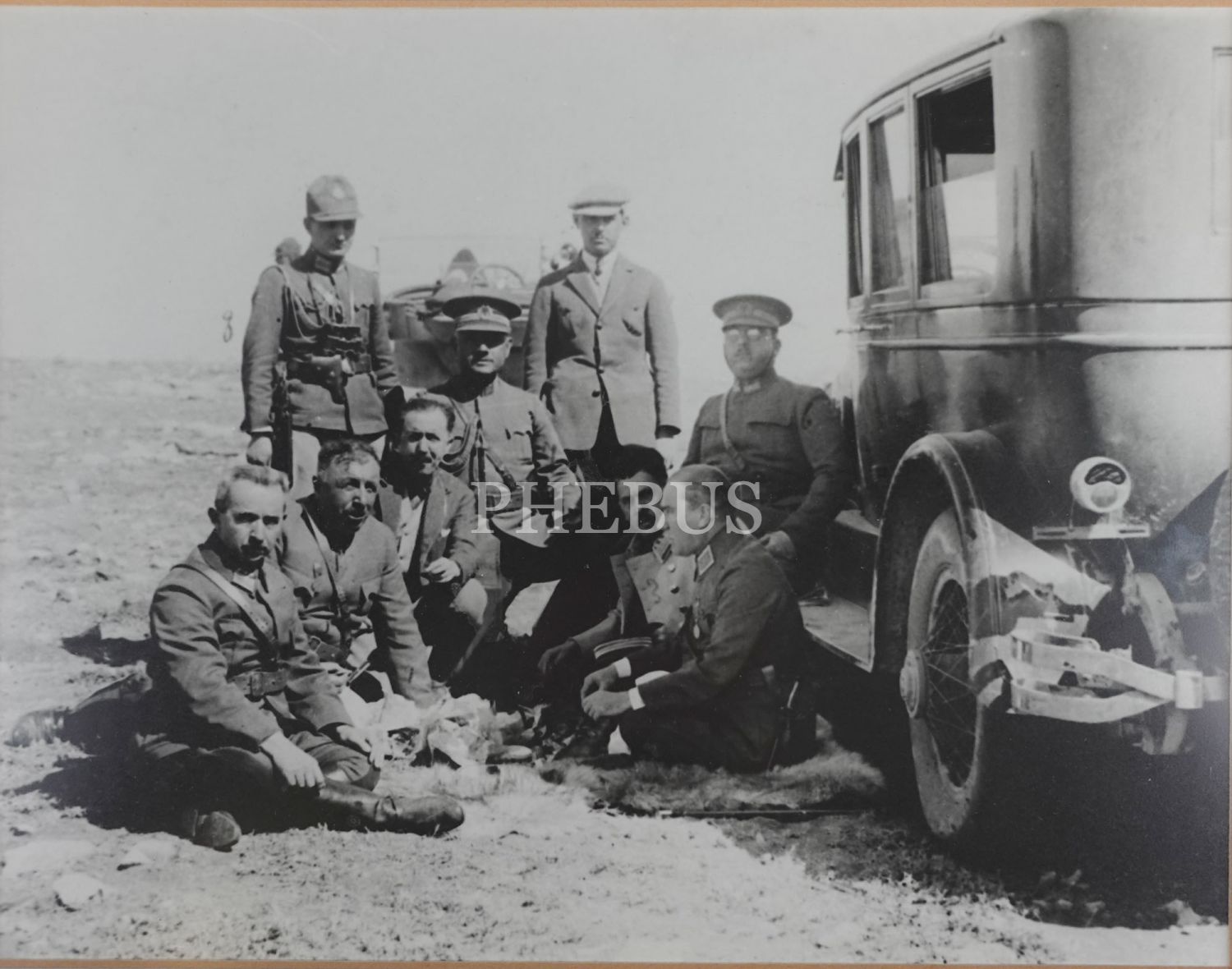 Mustafa Kemal Atatürk, İsmet İnönü, Fahrettin Altay ve Kazım Özalp, bir otomobilin gölgesinde dinlenip yemek yerken, fotoğraf 20x16 cm, çerçeve 34x30 cm...