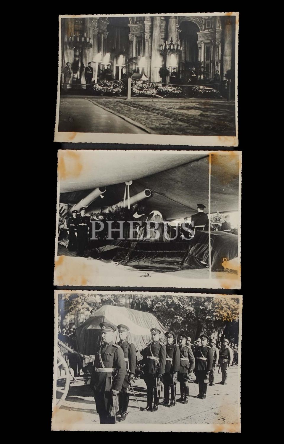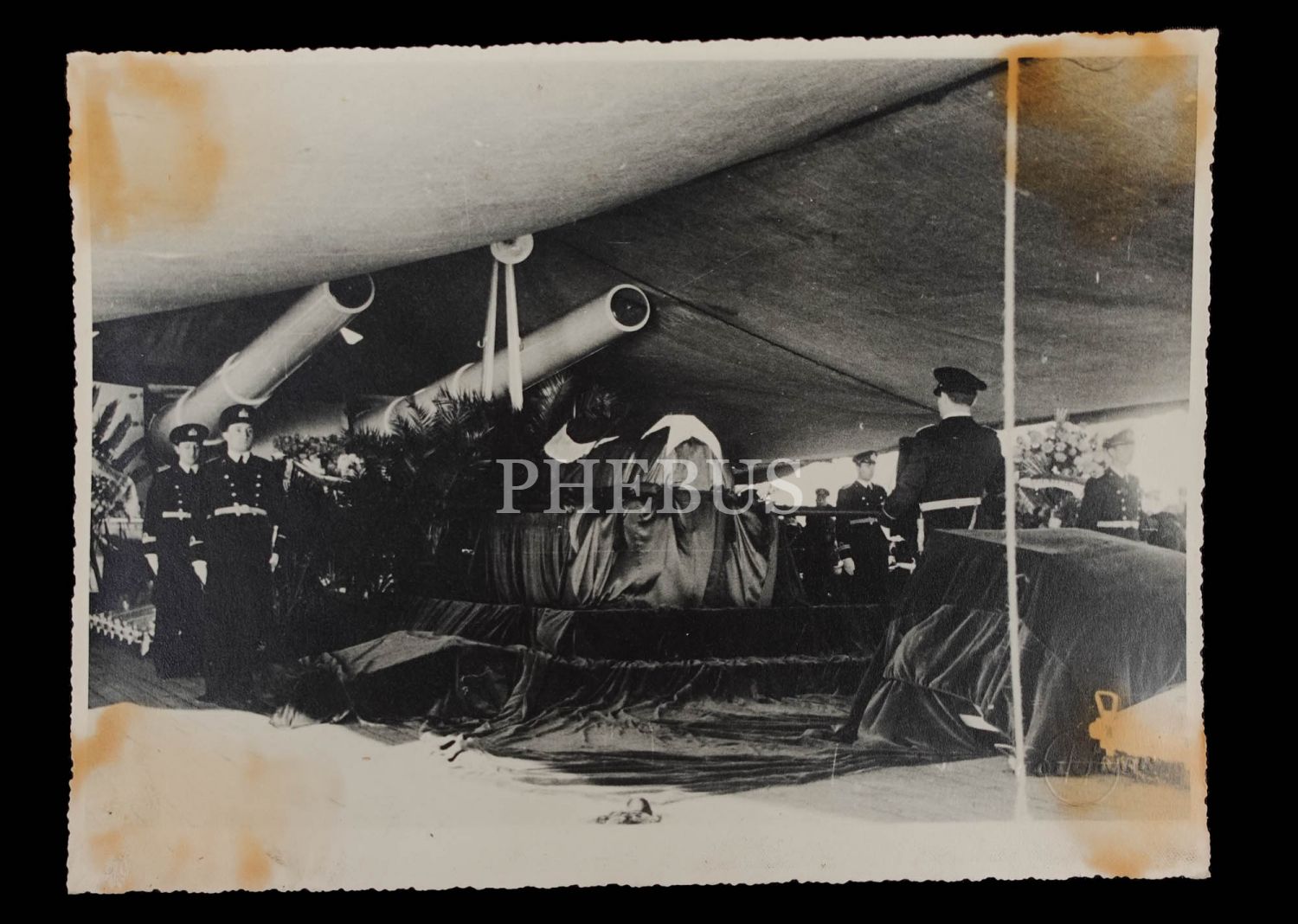Mustafa Kemal Atatürk´ün katafalkının Dolmabahçe Sarayı´nda sergilenirken, Yavuz zırhlısıyla nakledilirken ve askerler tarafından taşınırken görüldüğü, "Foto Nur" soğuk damgalı 3 adet fotoğraf, 23x17 cm...