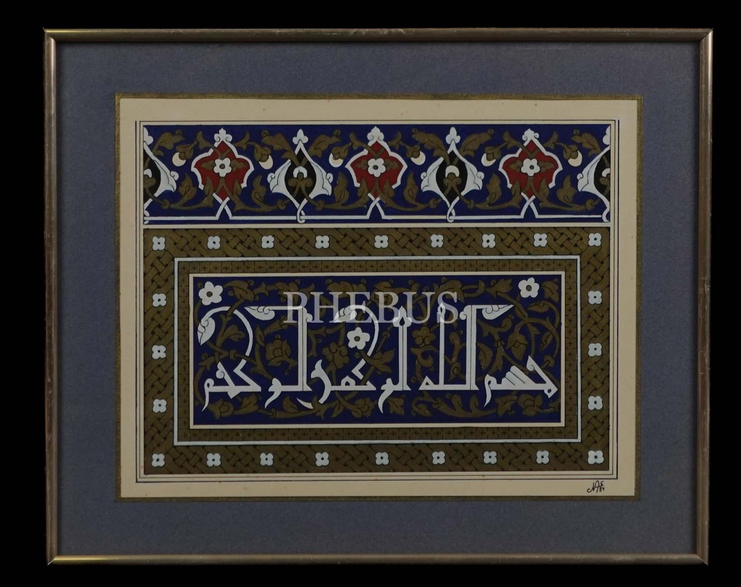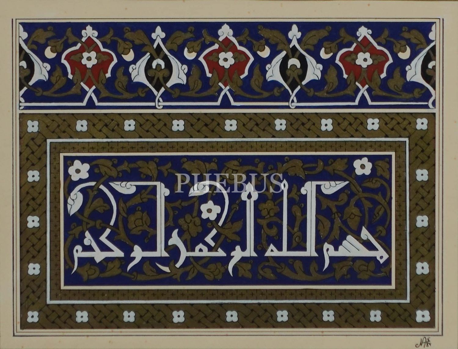 16. yy kitap tezyinatlarında kullanılan tarz ile, altın-lacivert tezhip içine beyaz mürekkeple yazılmış bir besmeledir. Eser Osmanlı dönemi bir eser değil, muhtemelen imzada yazan 84 (1984) tarihlidir.