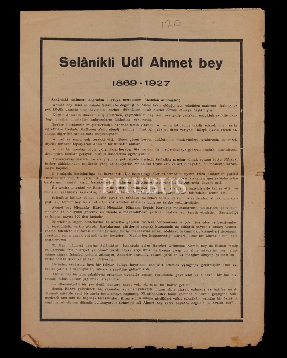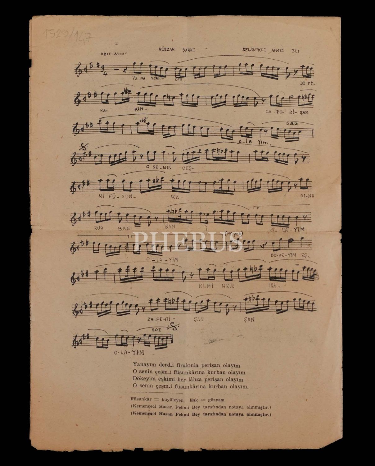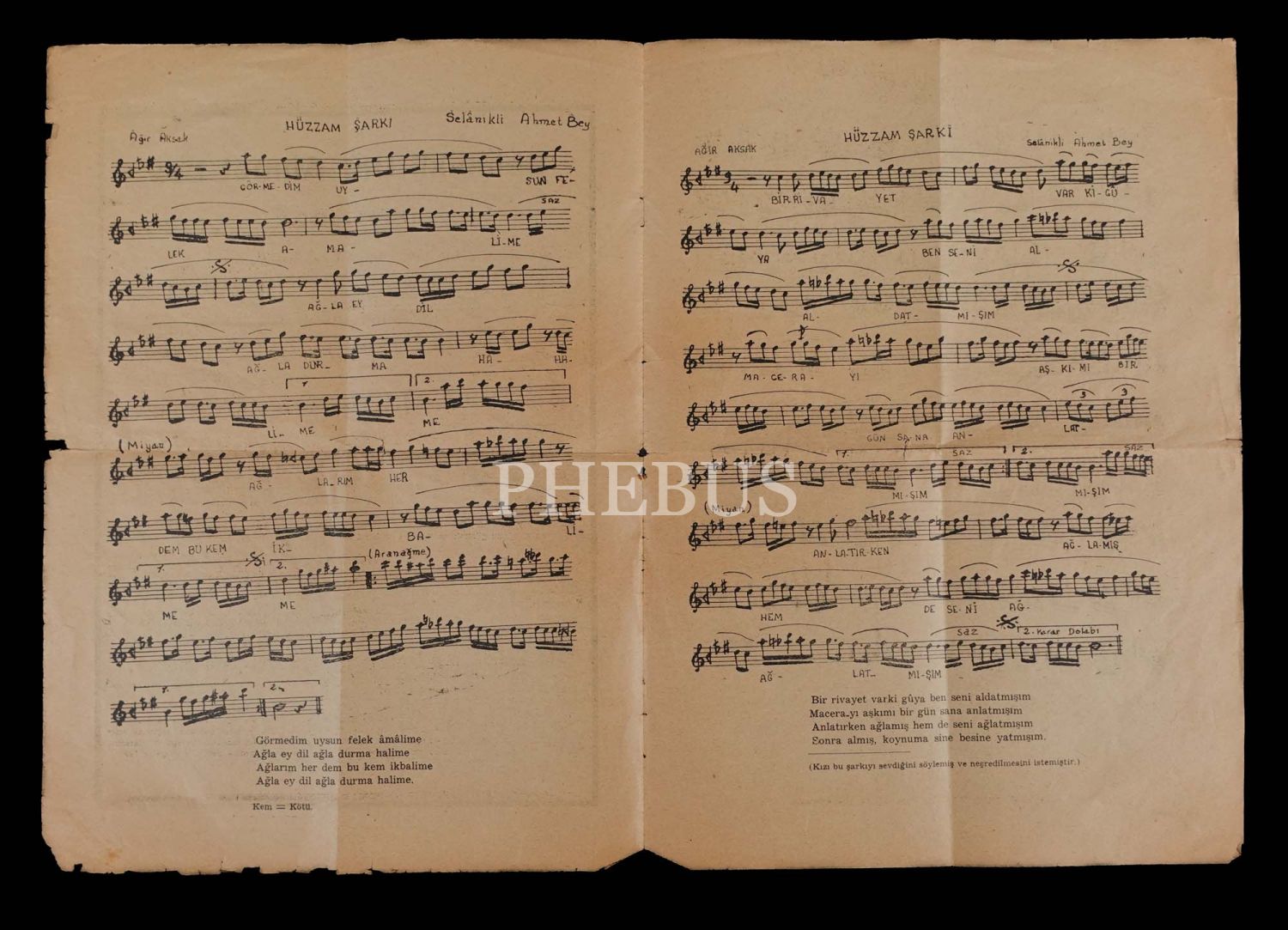 Selânikli Udî Ahmet Bey´in (1869-1927), doğrudan doğruya kızından alınmış biyografisiyle Hüzzam Şarkı notası, 20x29 cm...