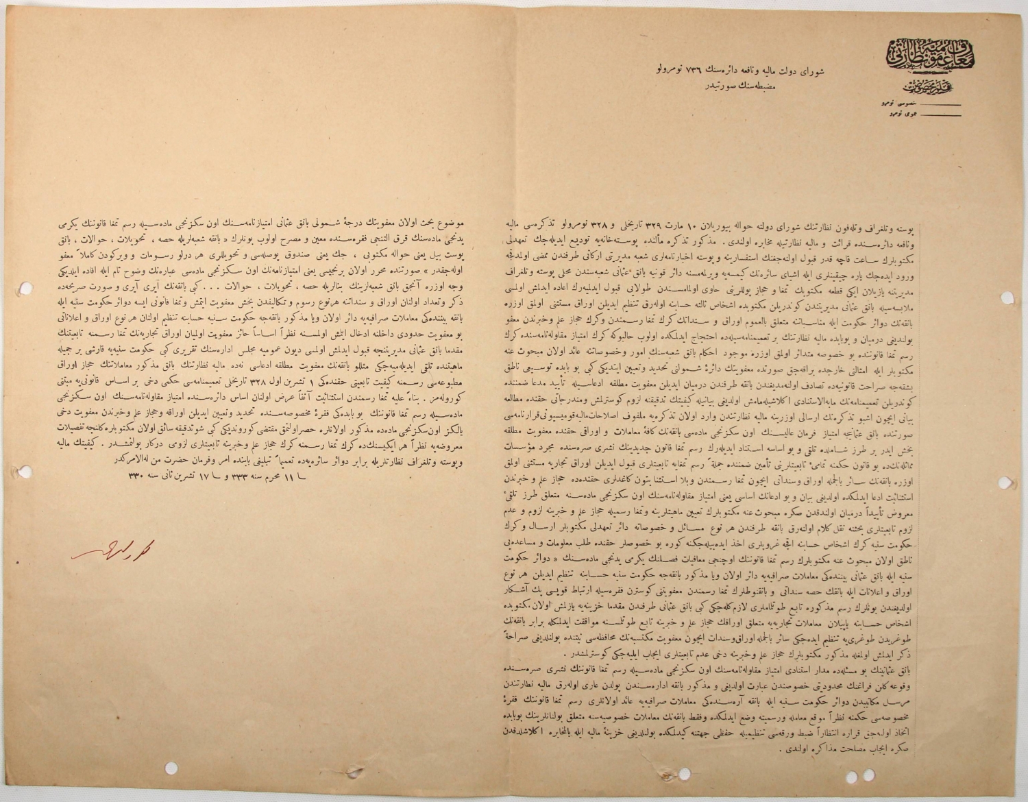 Osmanlıca Maarif- Umumiye Nezareti antetli Maliye ve Bayındırlık (nafia) dairesinin 736 numaralı tutanak sureti, 1330, 44x33 cm