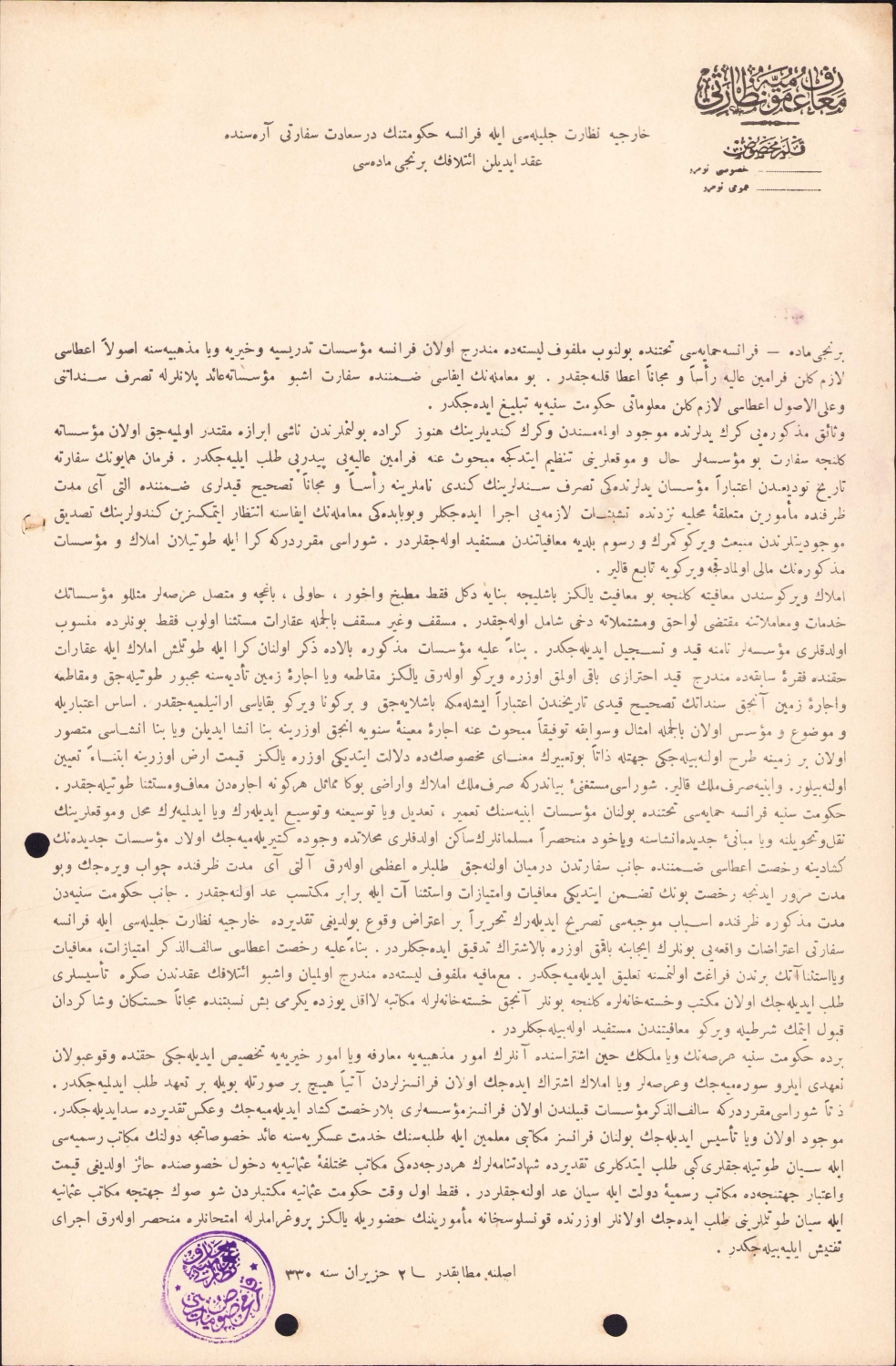 Osmanlıca Maarif-i Umumi Nezareti antetli hariciye nezareti celilesi ile Fransa hükümetinin Dersaadet Seferatı arasında