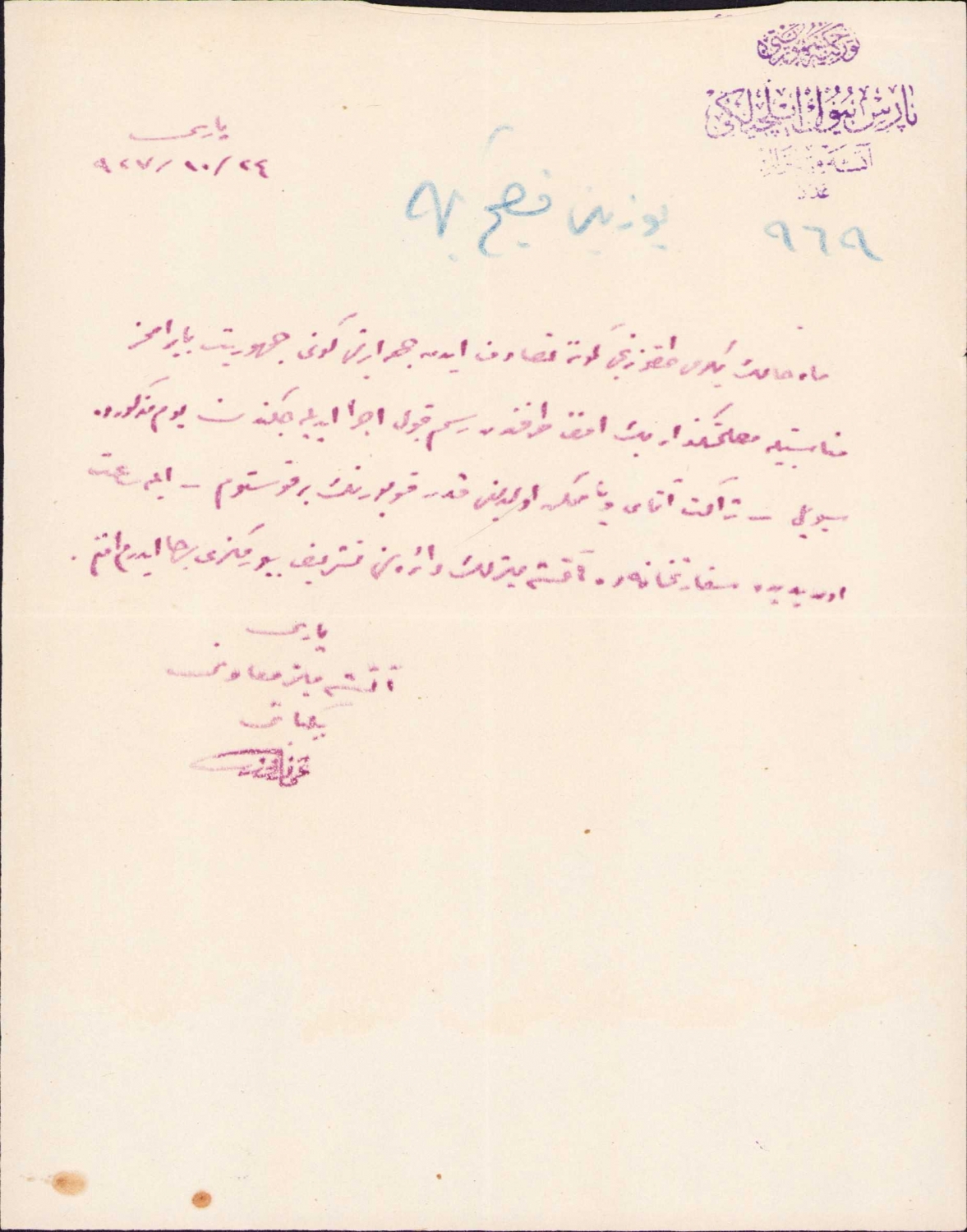 Osmanlıca Türkiye Cumhuriyeti Paris Büyükelçiliği Ataşemiliterliği antetli evrak, 1927, 15x19 cm