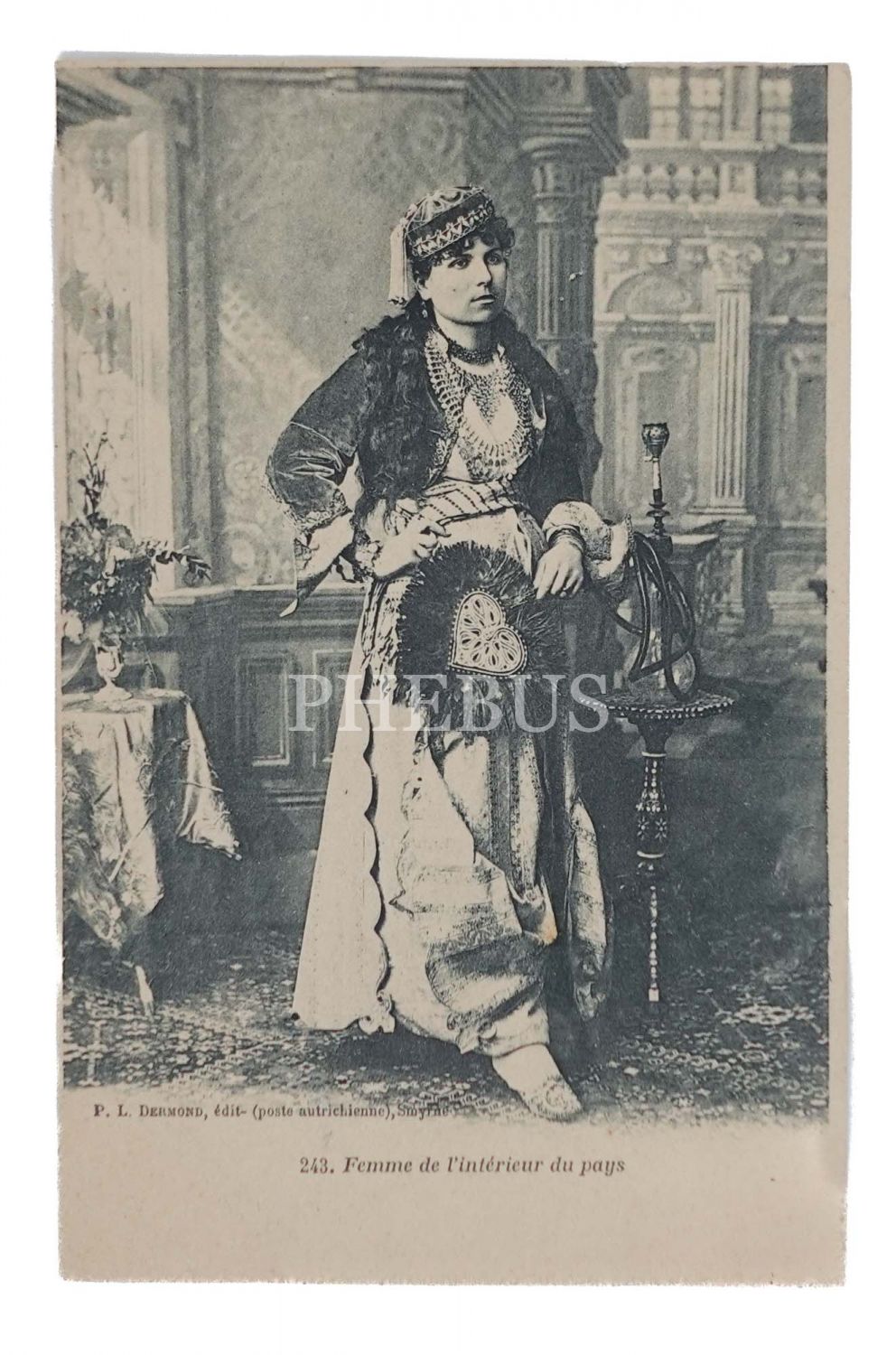 Yöresel kıyafetli Türk kadını, "Femme de l´interieur du payse", ed. P.L. Dermond, İzmir, 14x9 cm...
