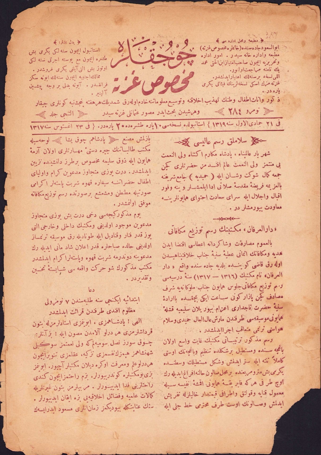 Osmanlıca Çocuklara Mahsus Gazete, 1318, 6 sayfa, haliyle, 20x28 cm