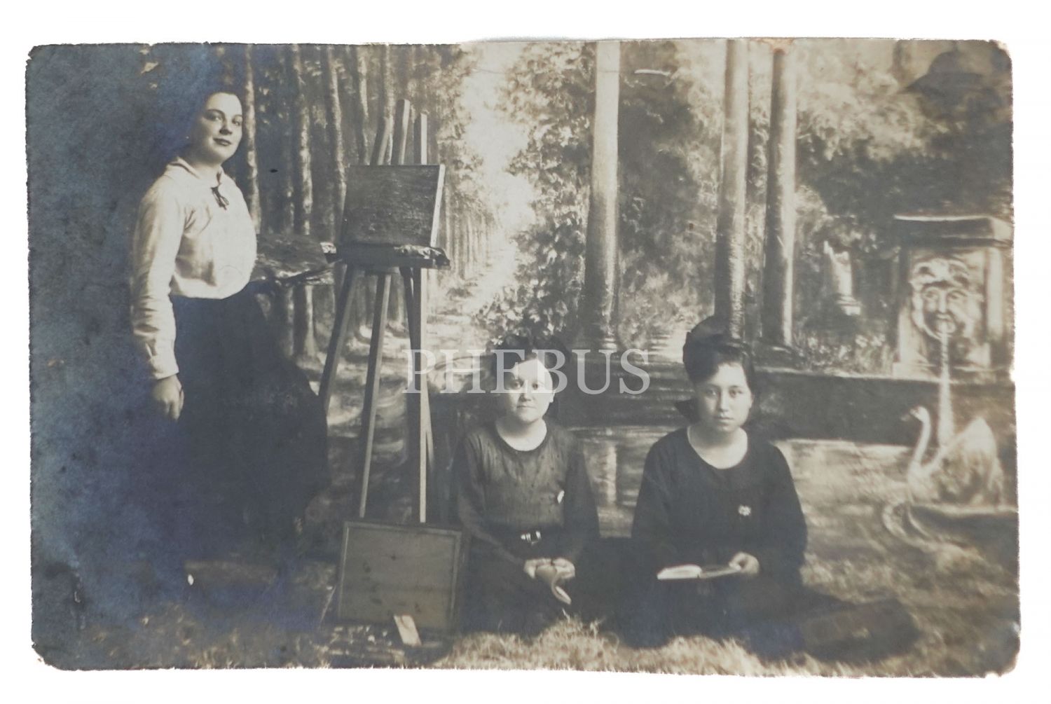 Resim atölyesi şeklinde dekore edilmiş stüdyoda poz veren kadınlar, 14x9 cm...