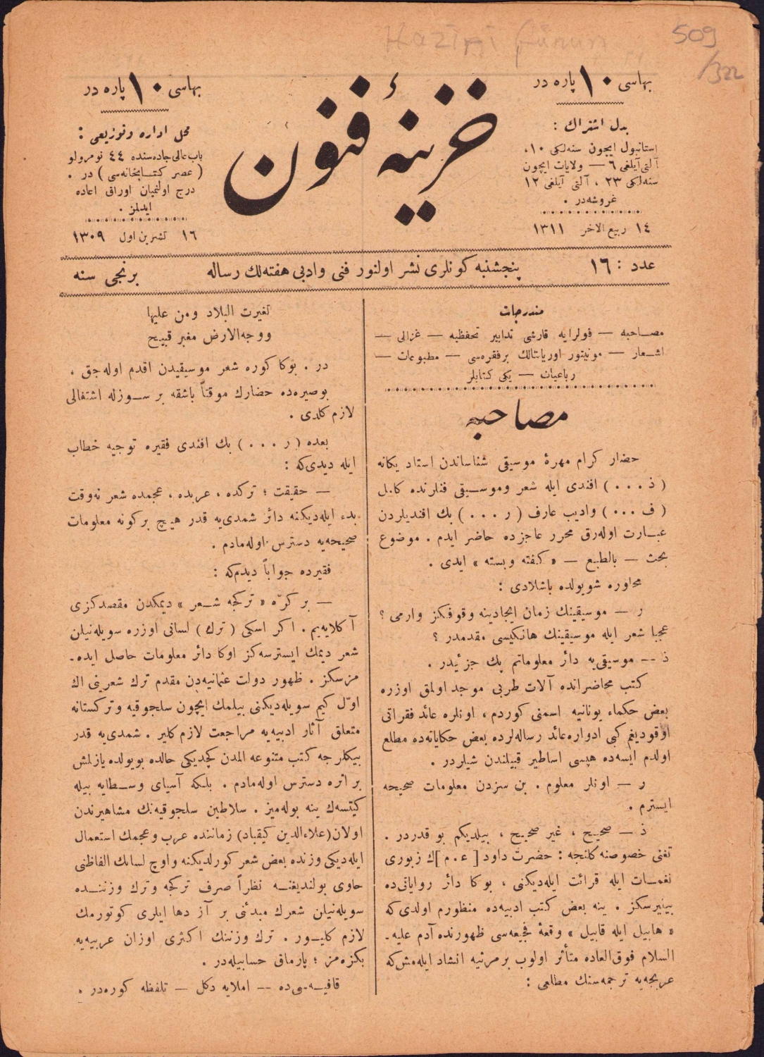 Osmanlıca Hazine-i Fünun risalesi, 1311, haliyle, 8 sayfa, 20x26 cm