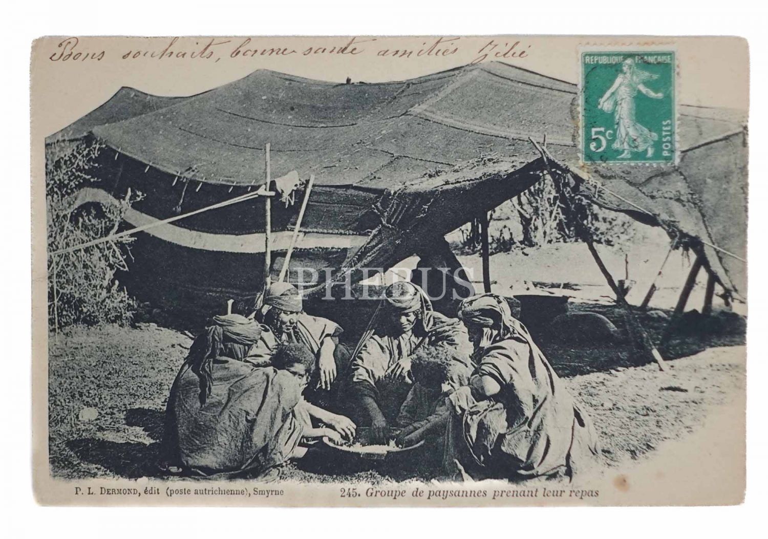 İzmir´de yörük ailesi, "Groupe de paysannes prenant leur repas", ed. P. L. Dermont, Smyrne, 14x9 cm...