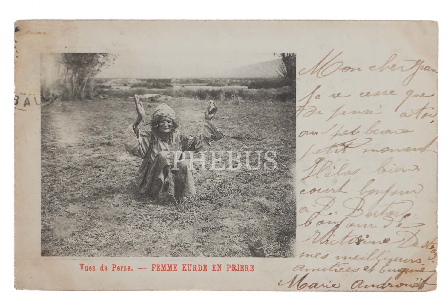 Yöresel kıyafetli kadın, "Vues de Perse - Femme Kurde en Priere", 14x9 cm...