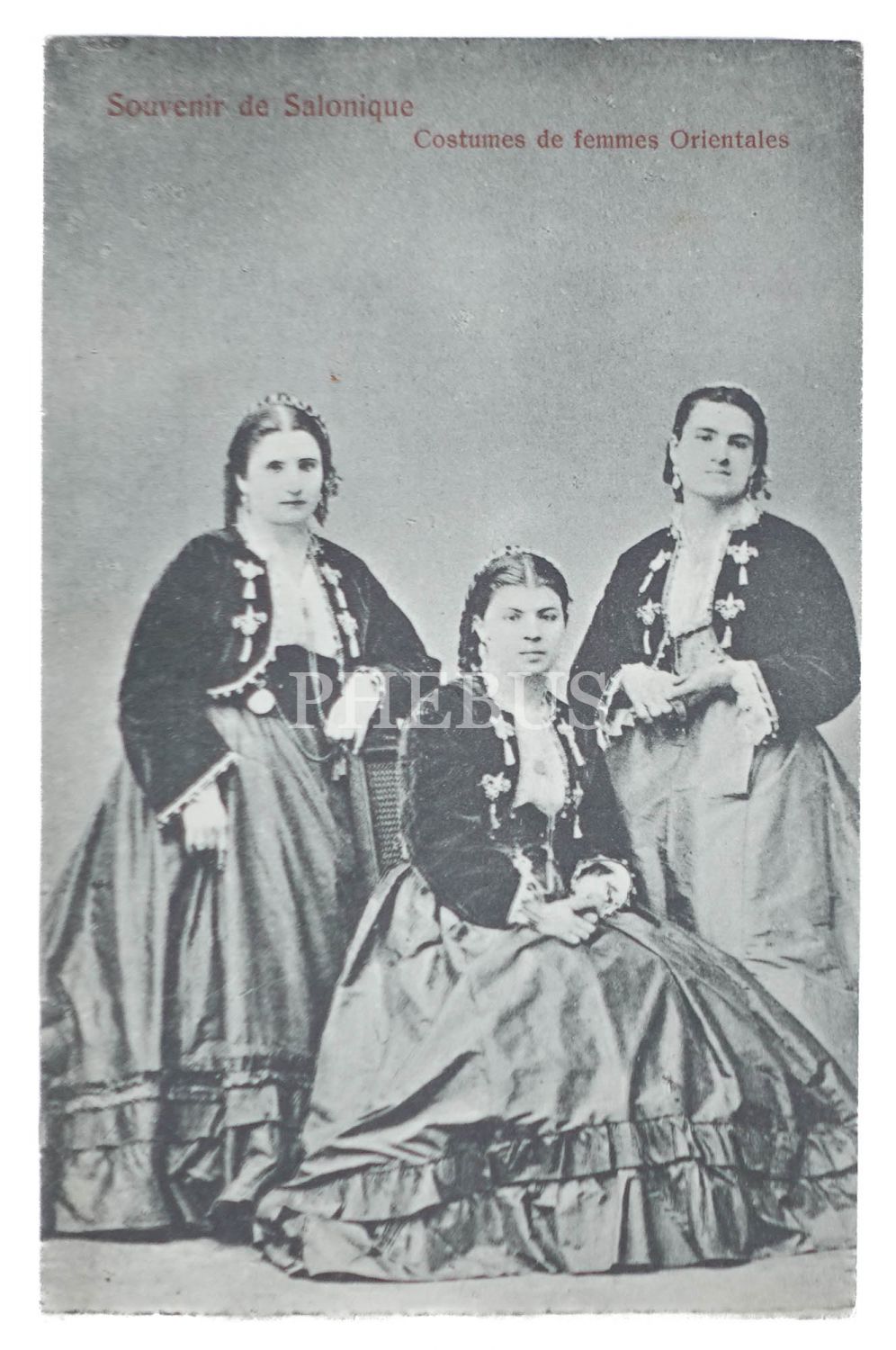 Selanikli yöresel kıyafetli kadınlar, "Costumes de femmes Orientales", ed. Albert J. Harzilai, 14x9 cm...