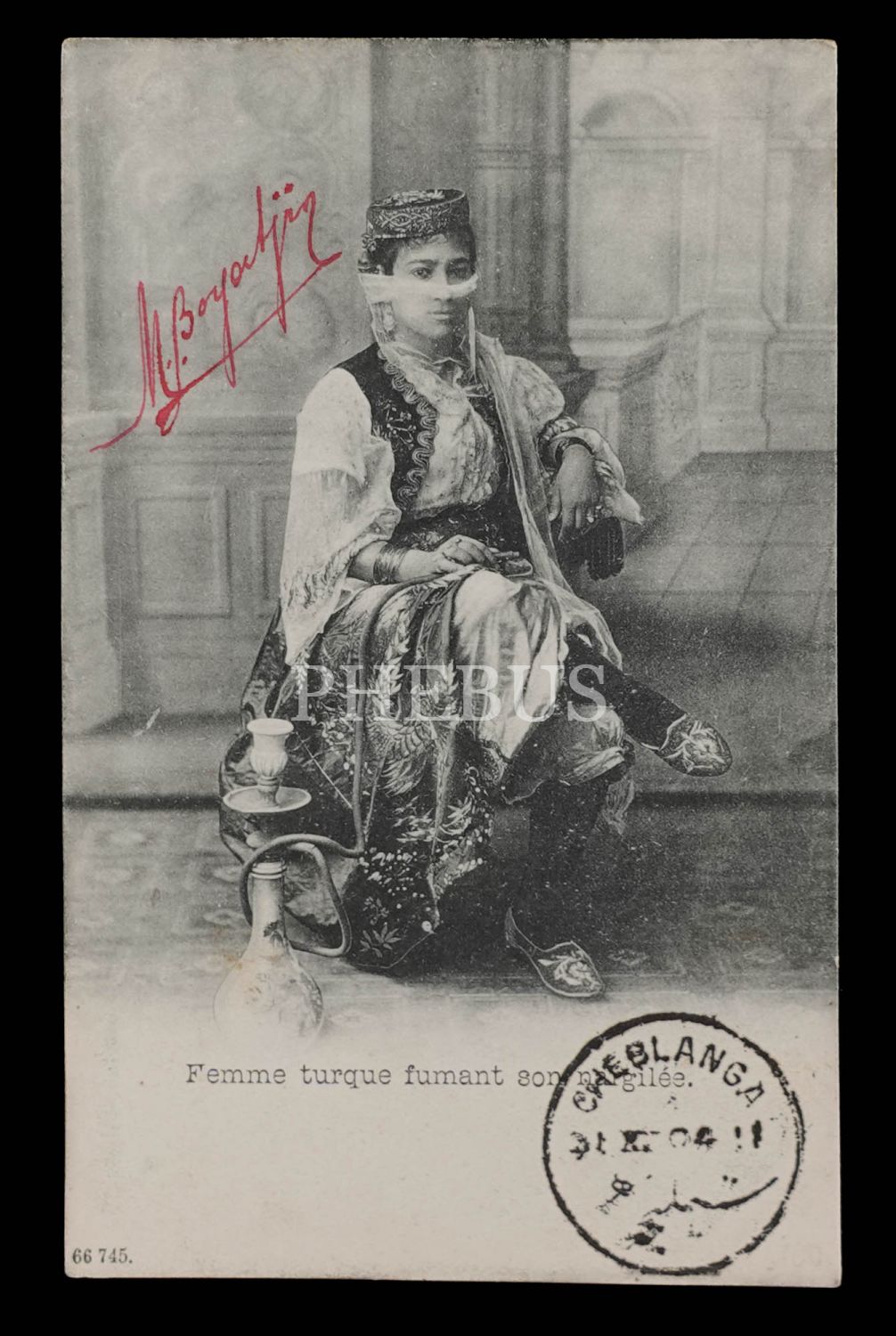 Türk kadını, "Femme turque fumant son nargilee", 14x9 cm...