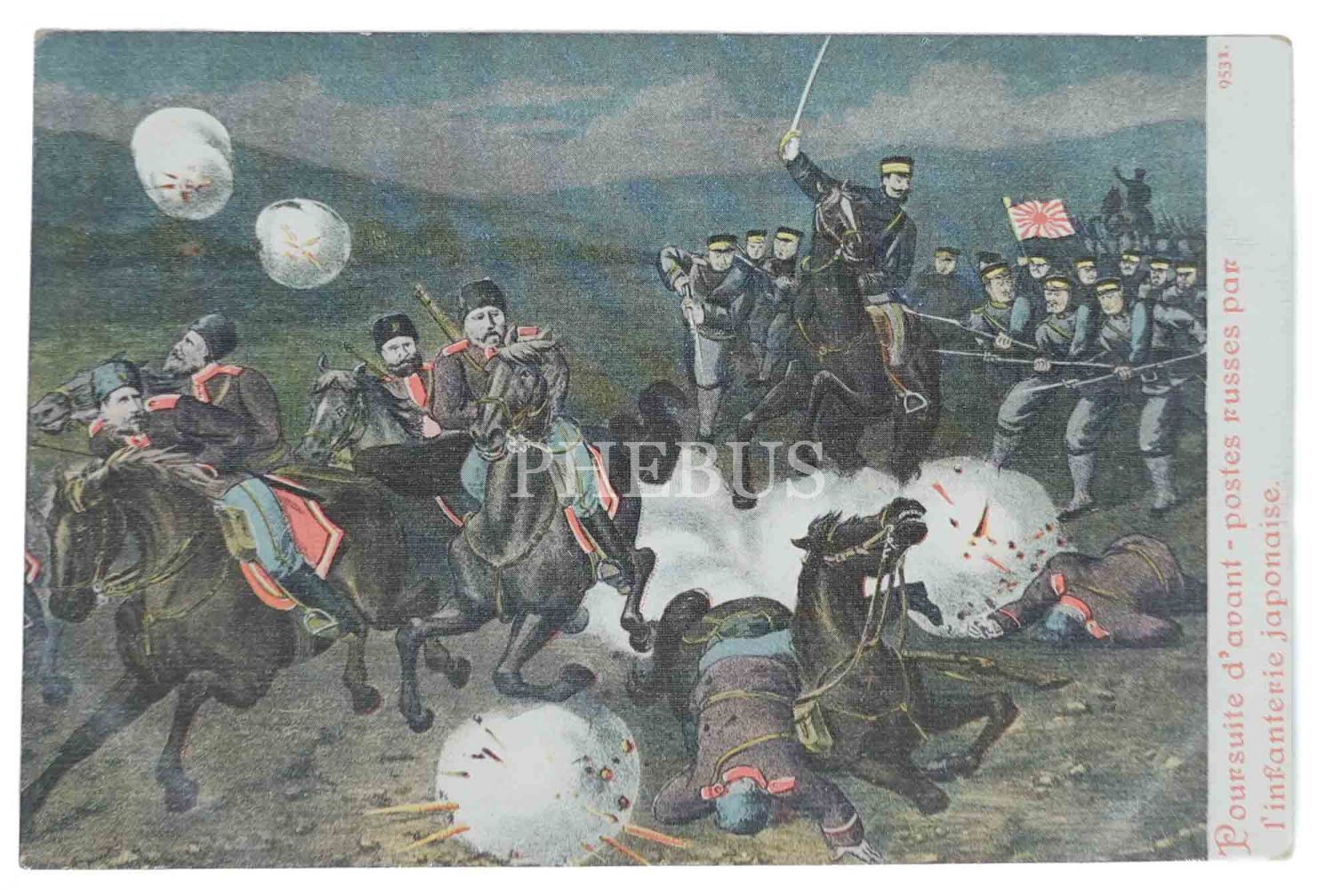 Japon piyadeleri tarafından Rus süvarilerine hücum, "Porsuite d´avant - postes russes par l´infanterie japonaise", 14x9 cm...