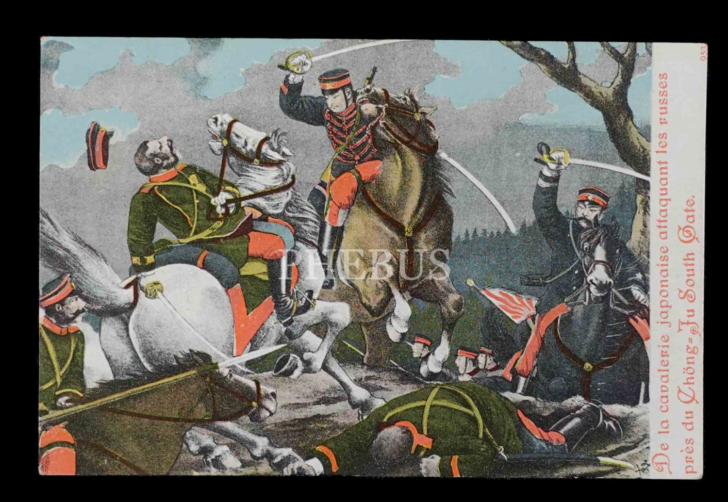 Japon süvarileri Güney Kapısı yakınlarında Ruslara saldırıyor, "De la cavalerie japonaise attaquant les russes pres du Chöng Fu South Gate", 14x9 cm...