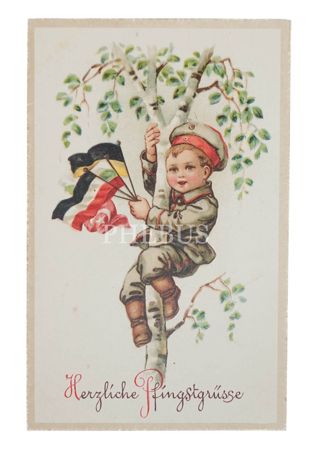İttifak devletlerinin bayraklarını elinde tutan çocuk görselli kartpostal, 14x9 cm...