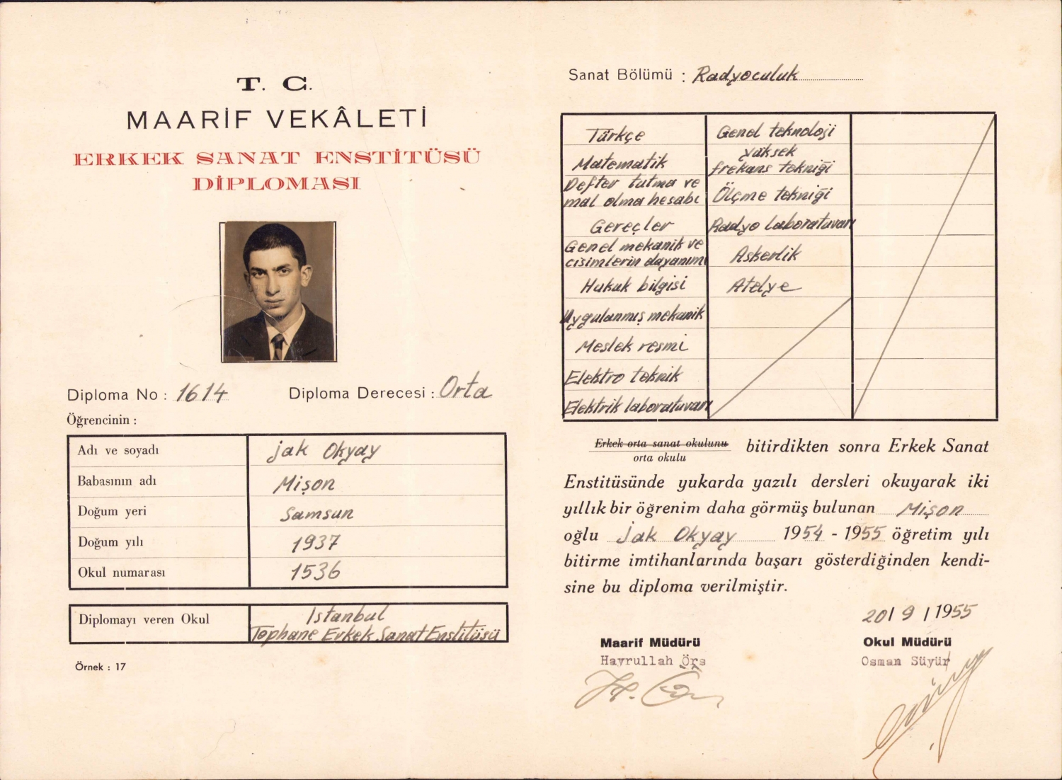 T.C. Maarif Vekaleti Erkek Sanat Enstitüsü Yahudi'ye verilmiş nadir RADYOCULUK diploması, 1955, 24x33 cm