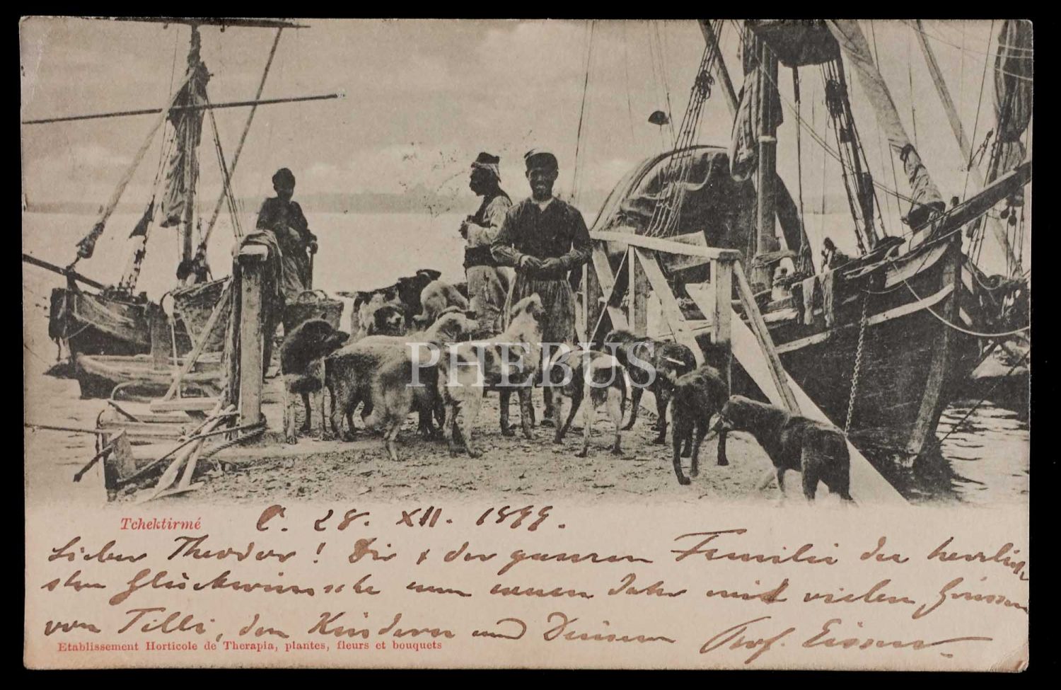 İskele´de gemiciler ve köpekler, 14x9 cm...