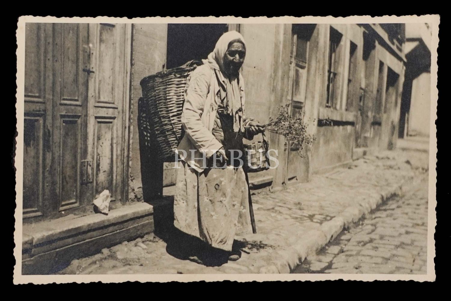 Sırtında sepetiyle poz veren bir teyze, 14x9 cm...