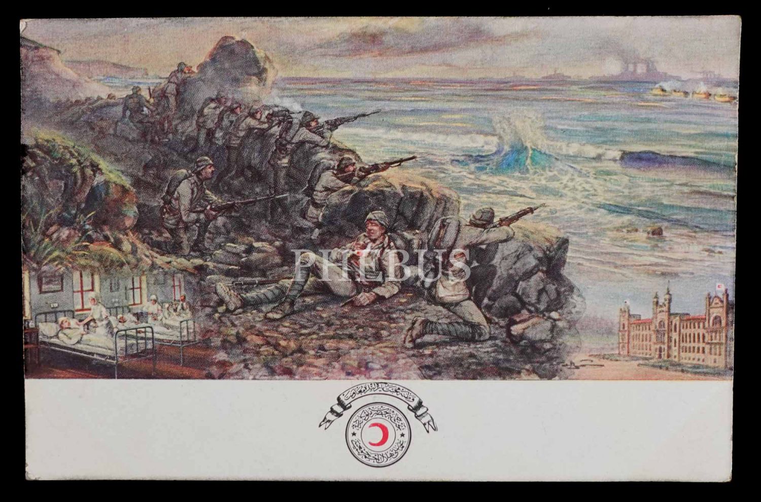 Cephede yaralanmış bir Türk askeri, Haydarpaşa Askeri Hastahanesi ve bu hastanenin içinde tedavi gören askerler görselli parçalı kartpostal, ed. Hilal-i Ahmer Cemiyeti, 14x9 cm...