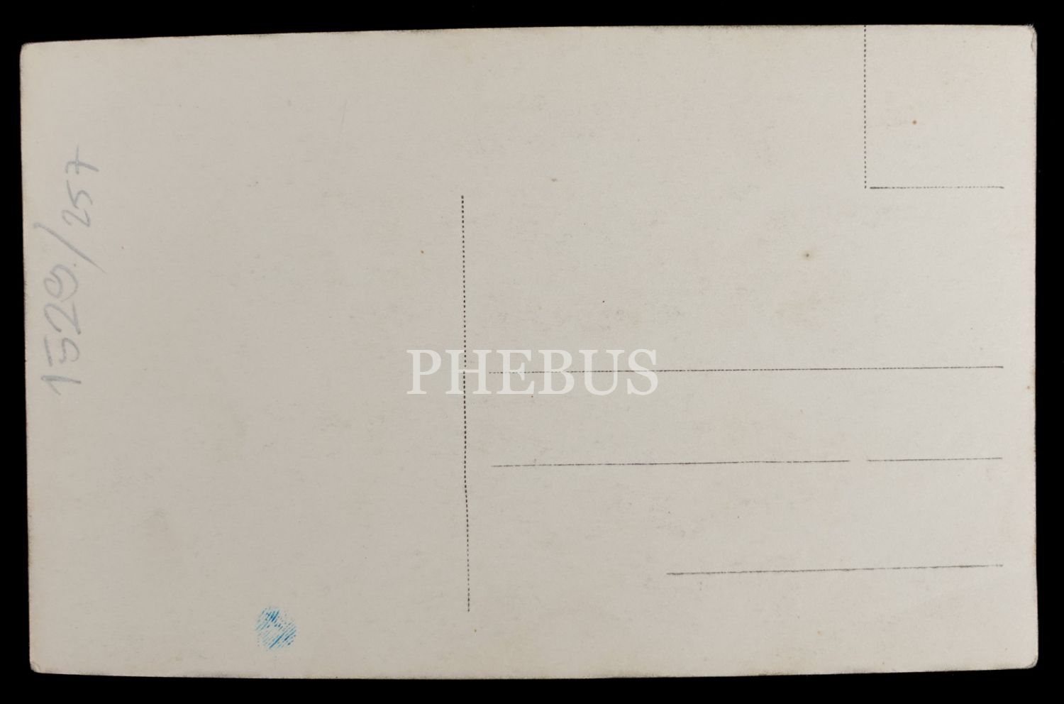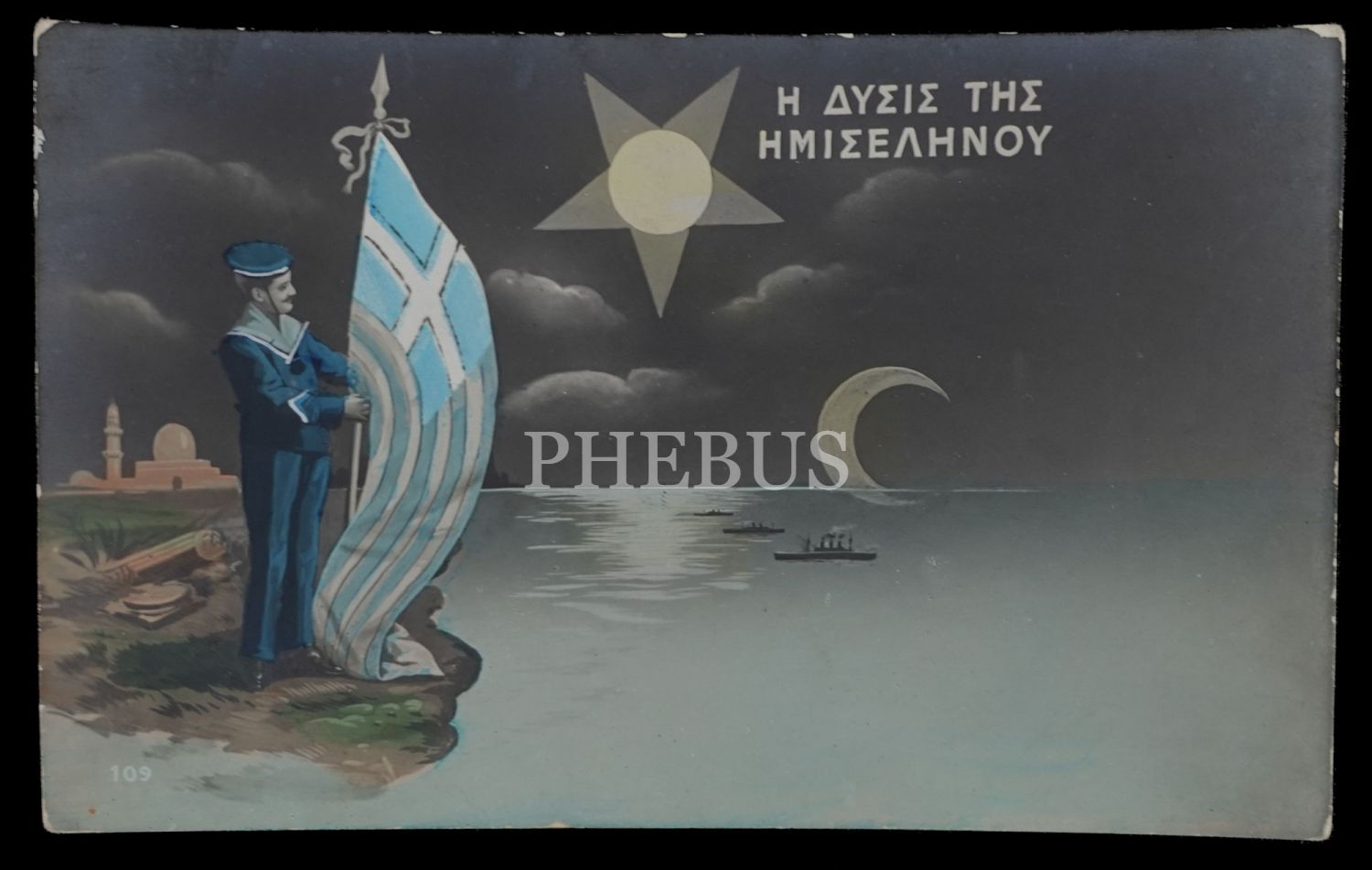 İstanbul silüeti önünde elinde Yunan bayrağı tutan Yunan askeri ve batan bir hilalin illüstre edildiği Rumca propaganda kartpostalı, 14x9 cm...