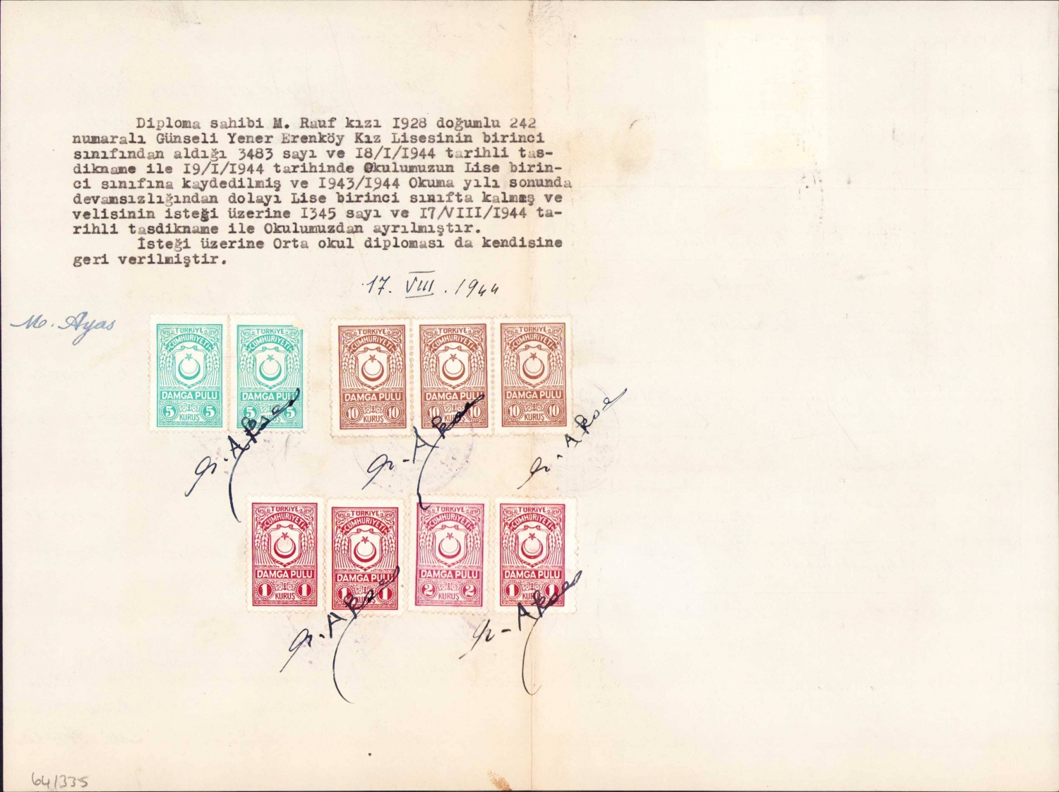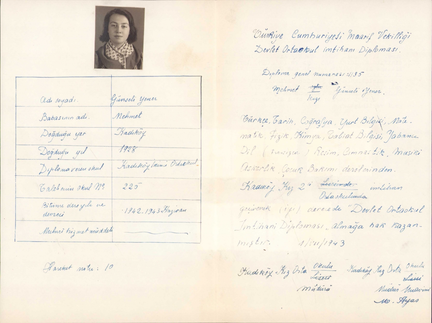Maarif Vekilliği Devlet Ortaokulu İmtihanı Diploması, 1943, el yapımı, 29x22 cm