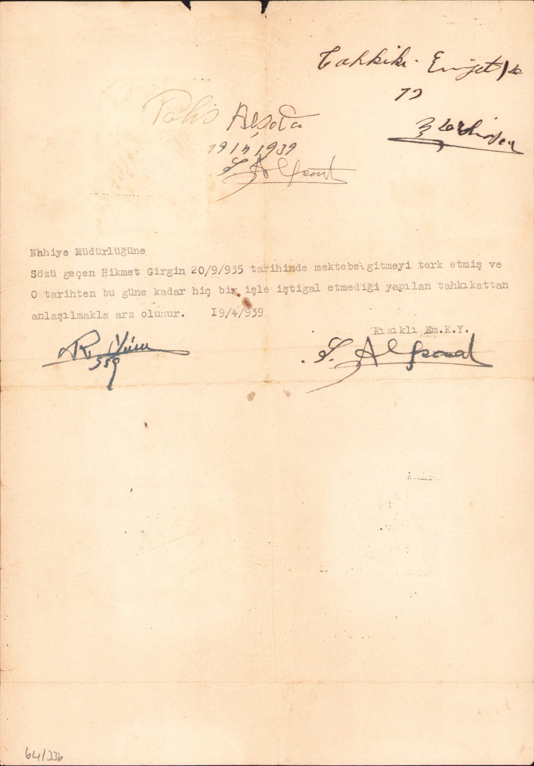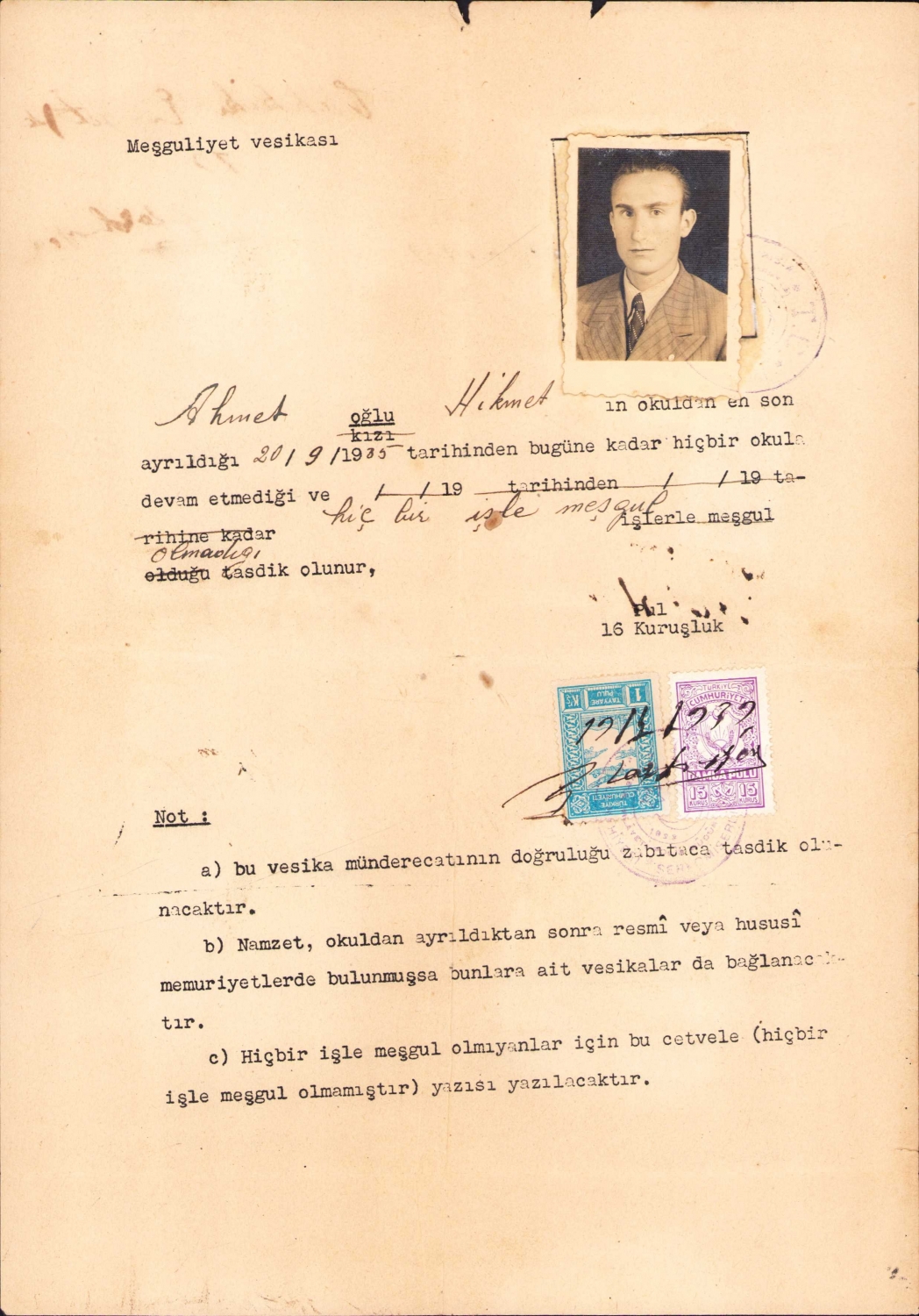 Meşguliyet vesikası 1935, 20x30 cm
