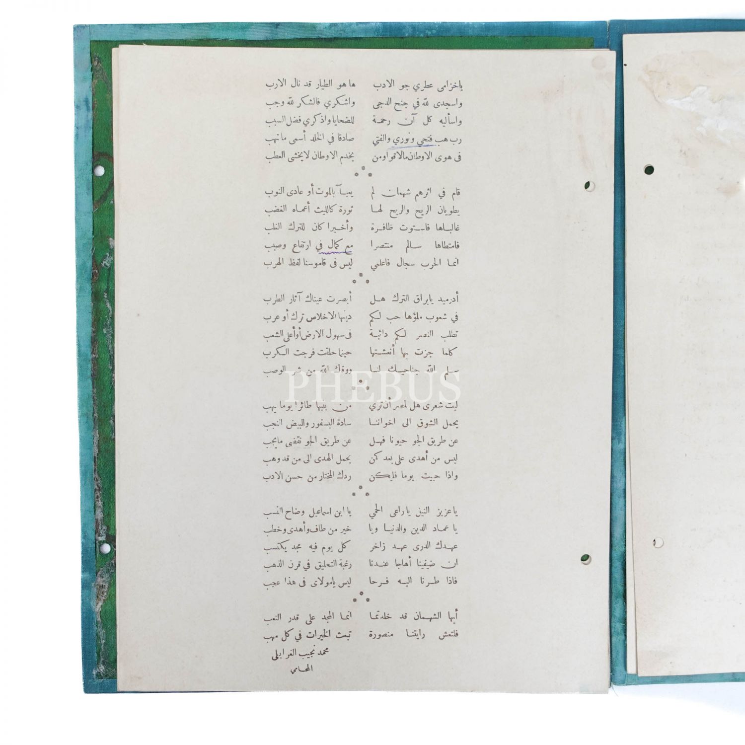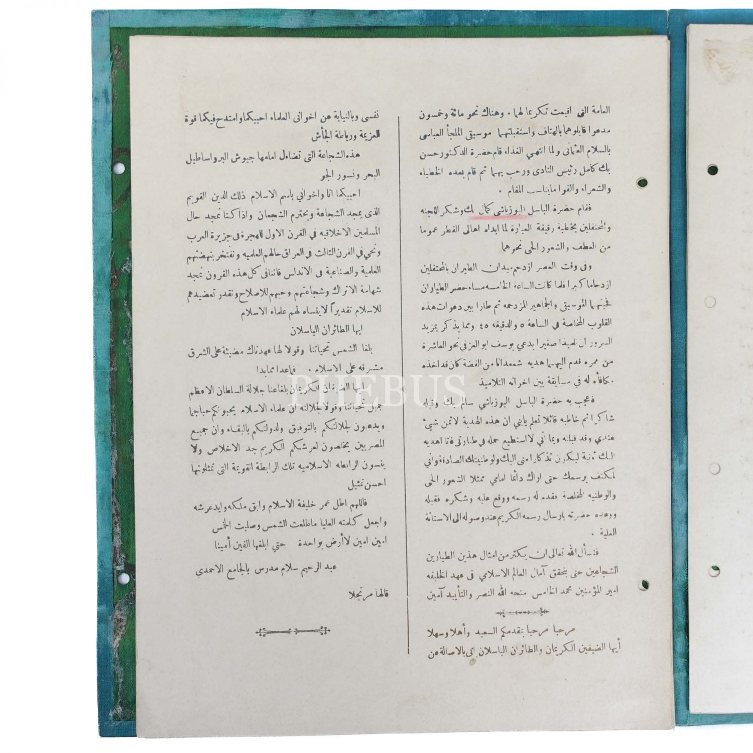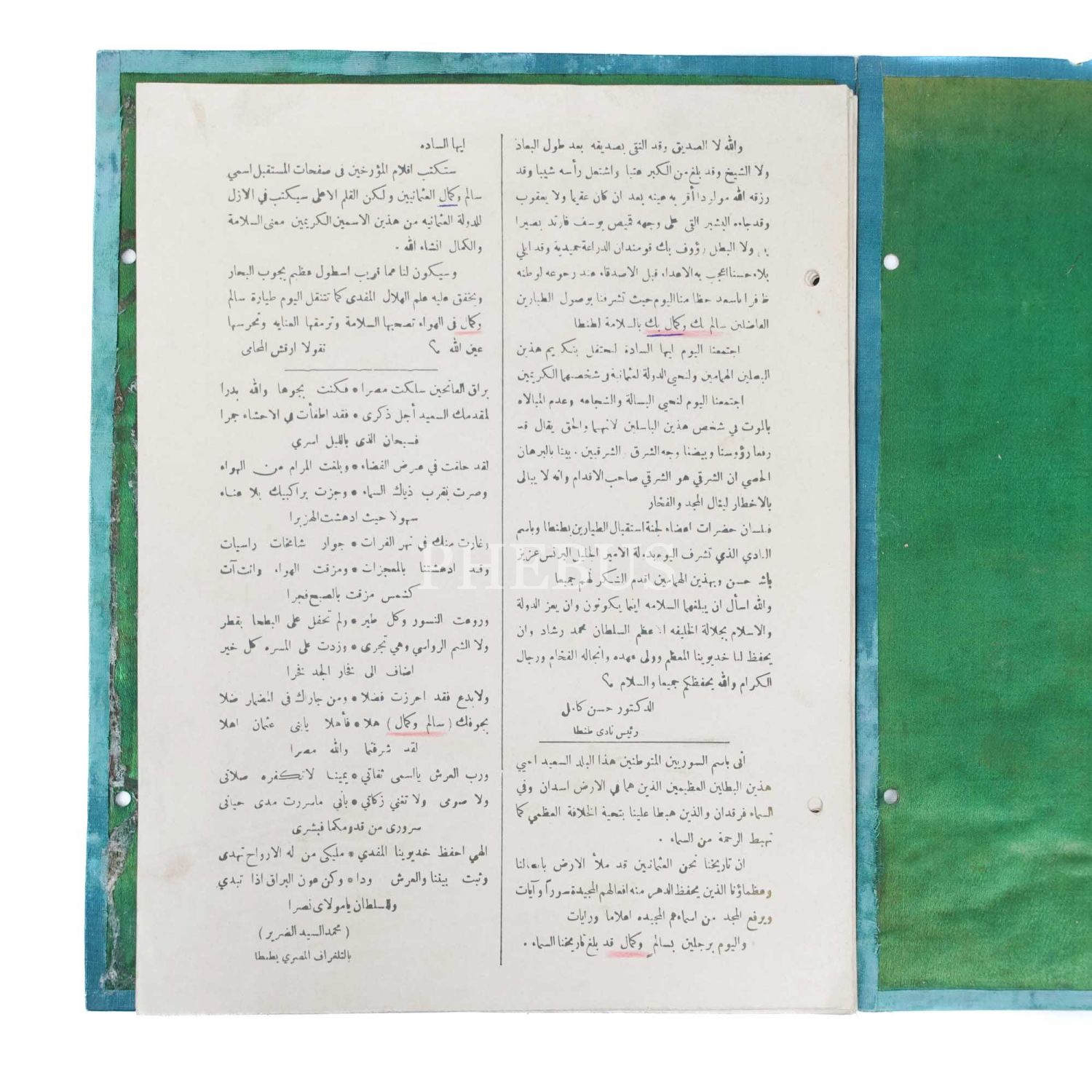 İstanbul´dan Kahire´ye gerçekleştirdikleri tarihi uçuş sonrasında, şereflerine verilen yemekte Yüzbaşı Kemal Bey´e takdim edilen Arapça metin, 5 sayfa, 27x34 cm...