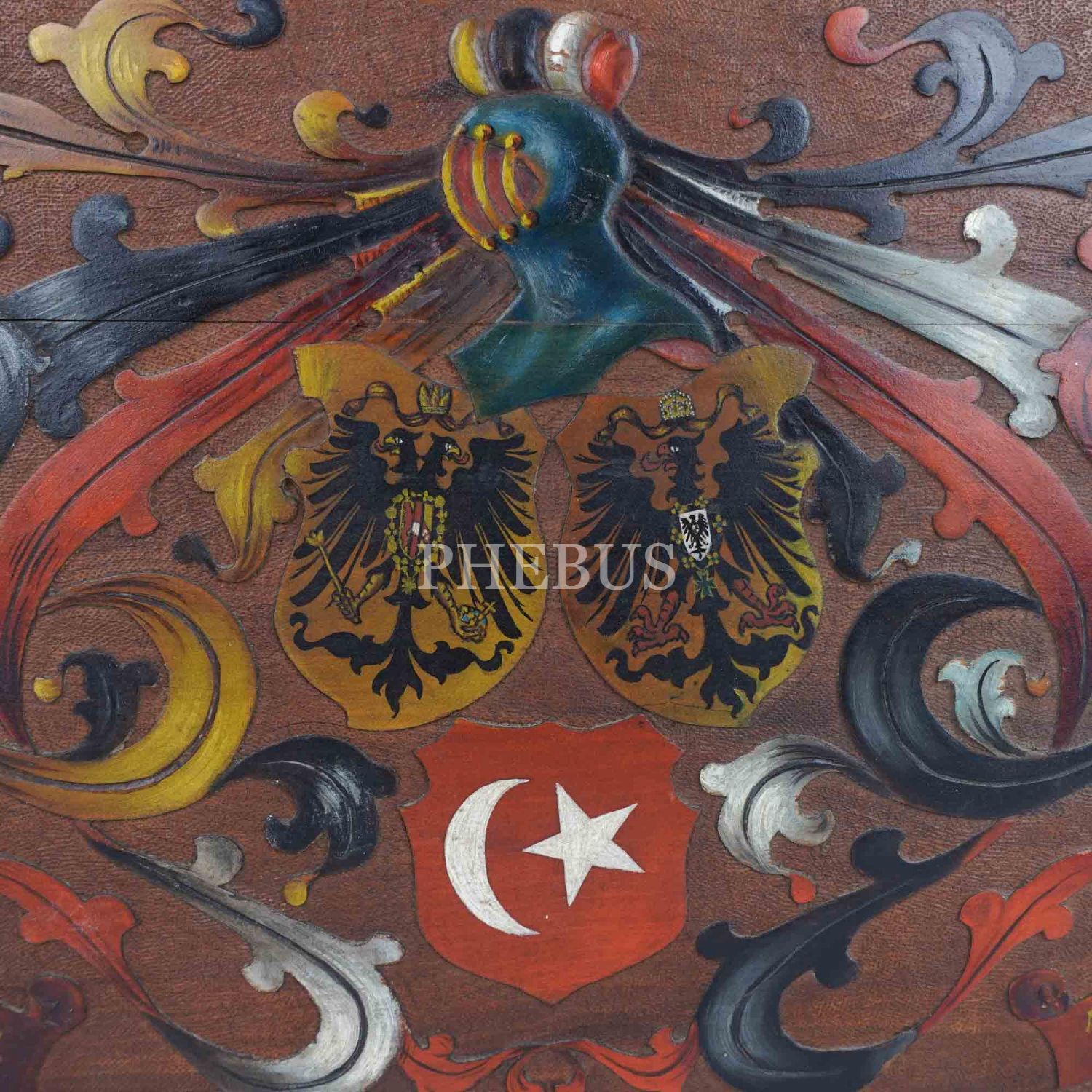 El oyma ve el boyama, Prusta Kartalı ve Türk Arması detaylı, "1914-1915" ibareli ahşap İttifak panosu, 51x37 cm...