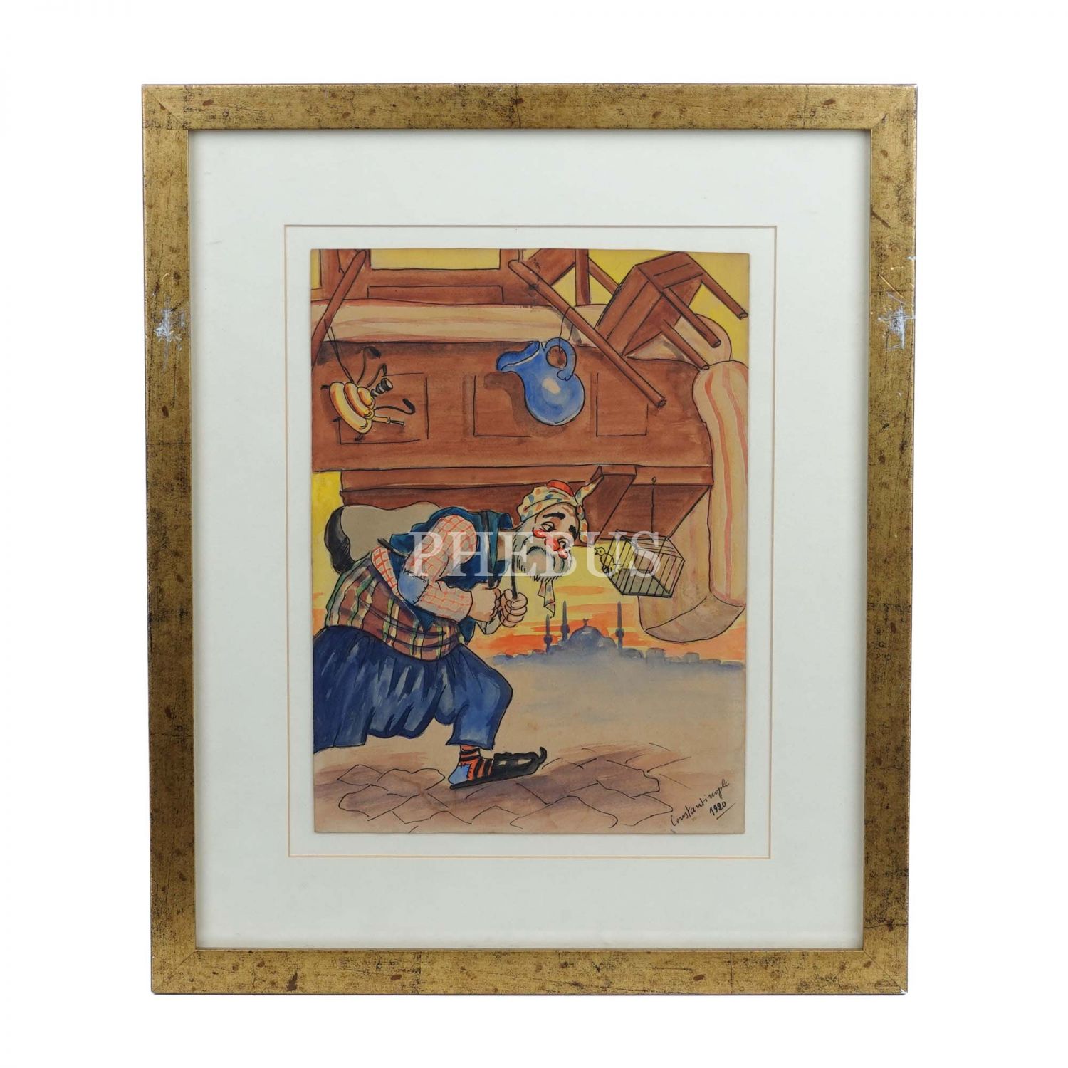 "Constantinople - 1920" ibareli, yaşlı bir hamal konulu orijinal resim, kâğıt üzerine çini mürekkebi ve suluboya, resim 19x26 cm, çerçeve 34x41 cm...