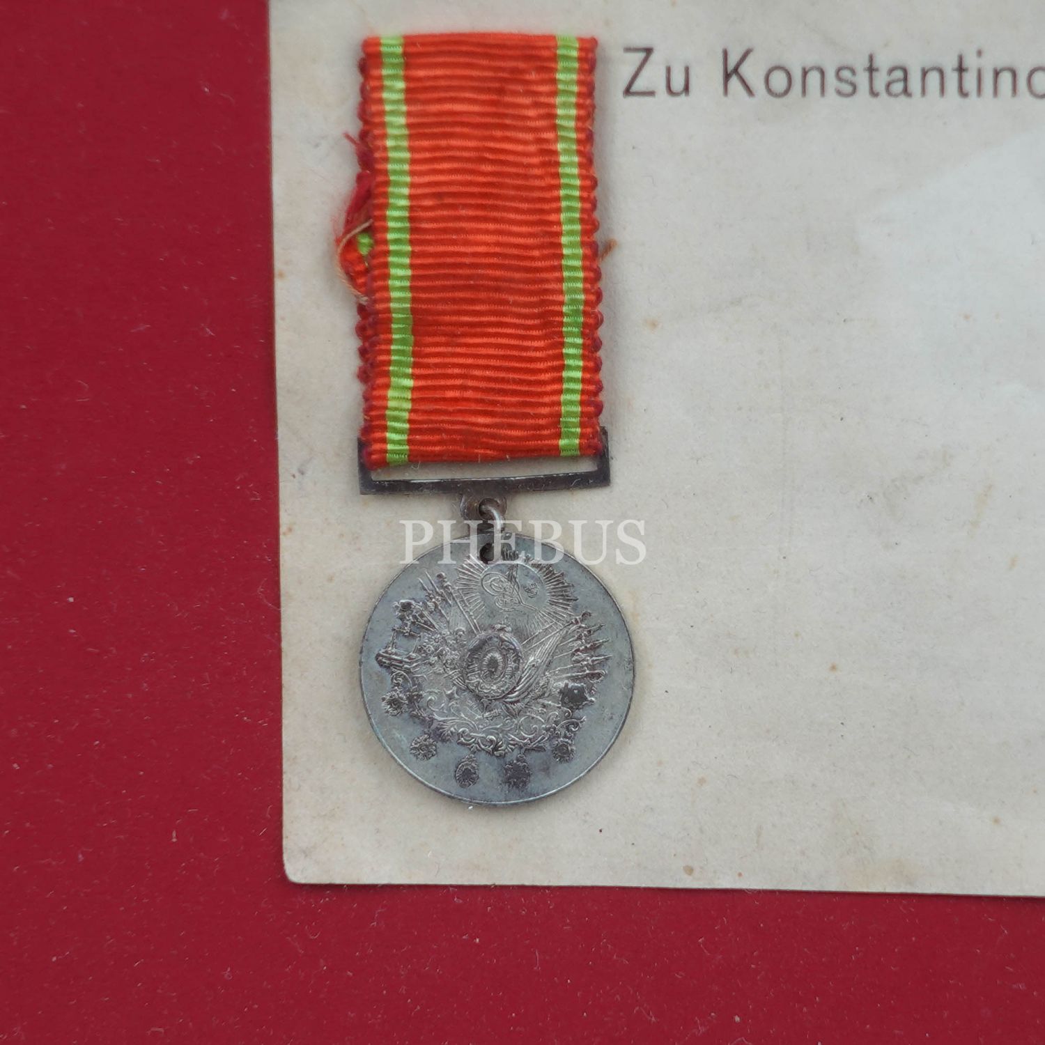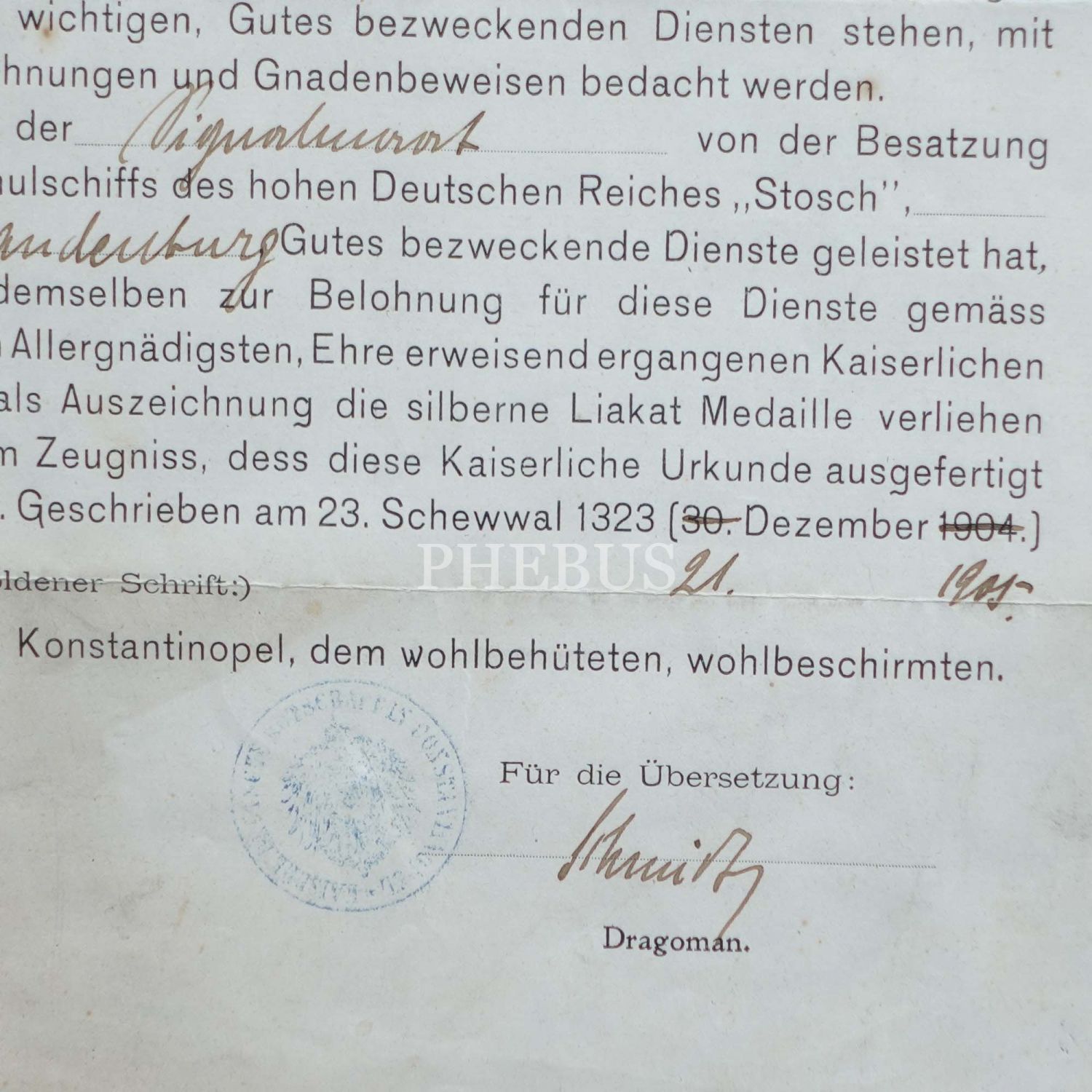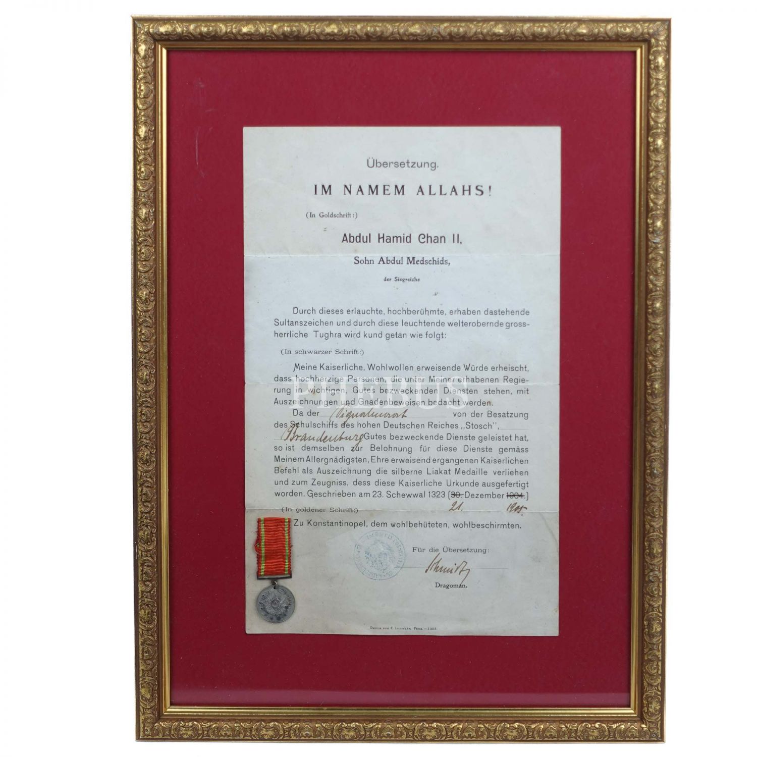 Dostluk göstergesi olarak İstanbul´u ziyaret eden Alman eğitim gemisi Stosch´ta vazifeli bir mürettebata Sultan İkinci Abdülhamid tarafından ihsan edilen Liyakat Madalyası (gümüş) ve Alman Sefareti dragomanı tarafından tercüme edilen Almanca beratı, 23 Şevval 1323 (21 Aralık 1905), Druck von F. Loeffler (Löfler), Pera, çerçevesiyle birlikte 34x47 cm...