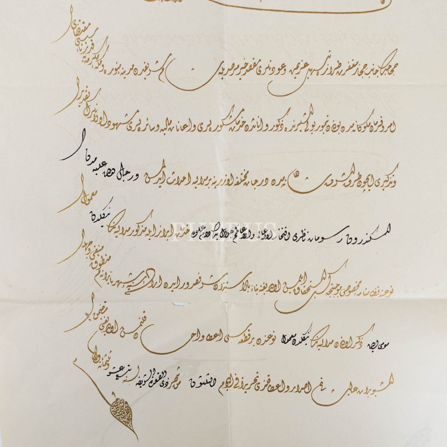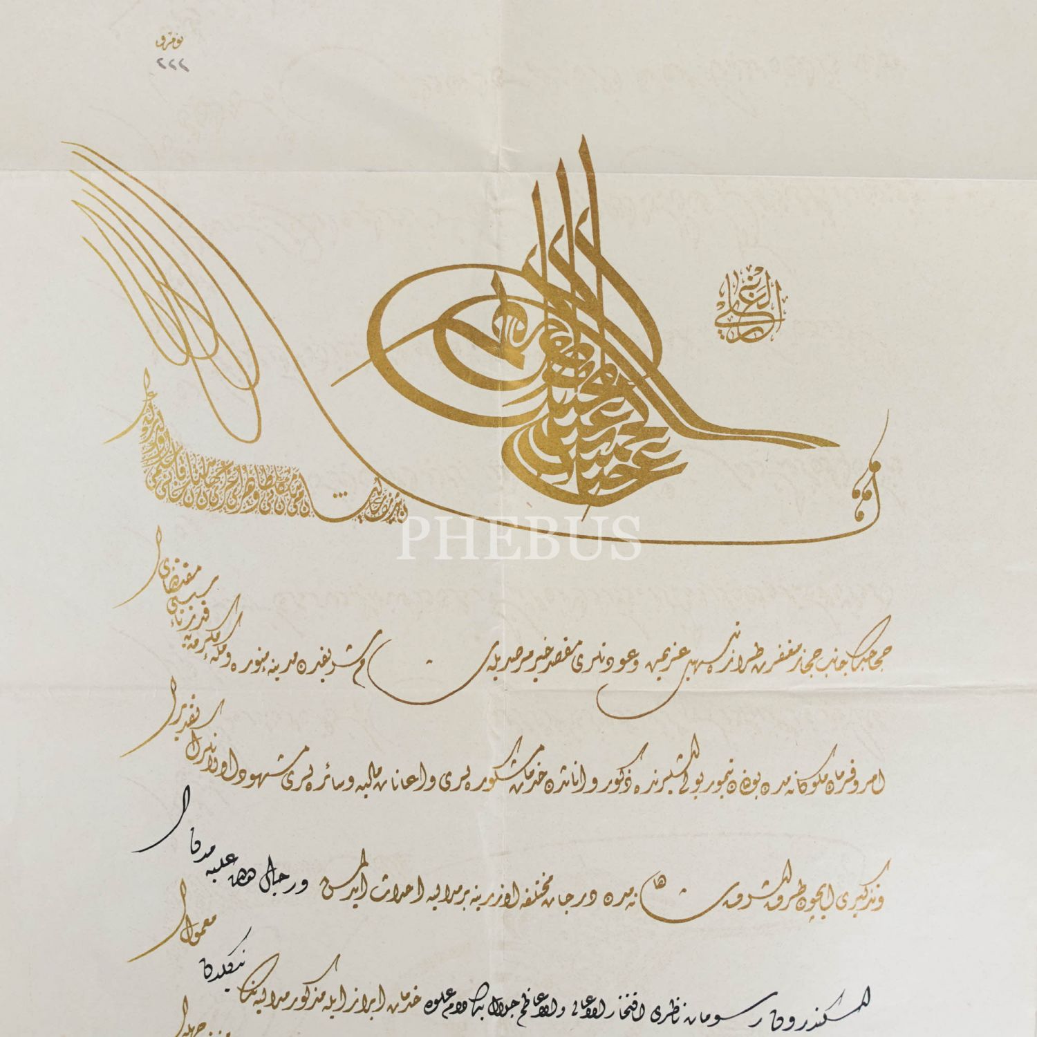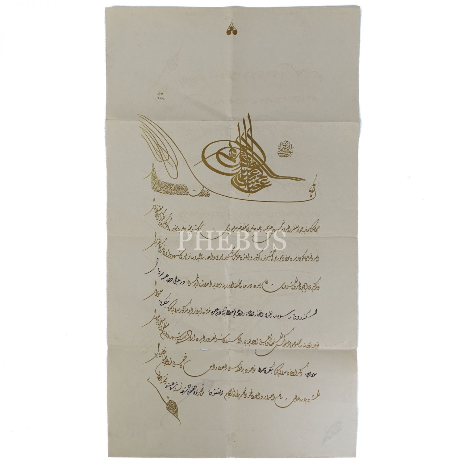 İskenderun Rüsumat (vergi) Nazırı Celal Bey´e verilen nikelden mamul Hamidiye Hicaz Demiryolu Madalyası´nın Sultan İkinci Abdülhamid tuğralı beratı, 1329, 32x57 cm...