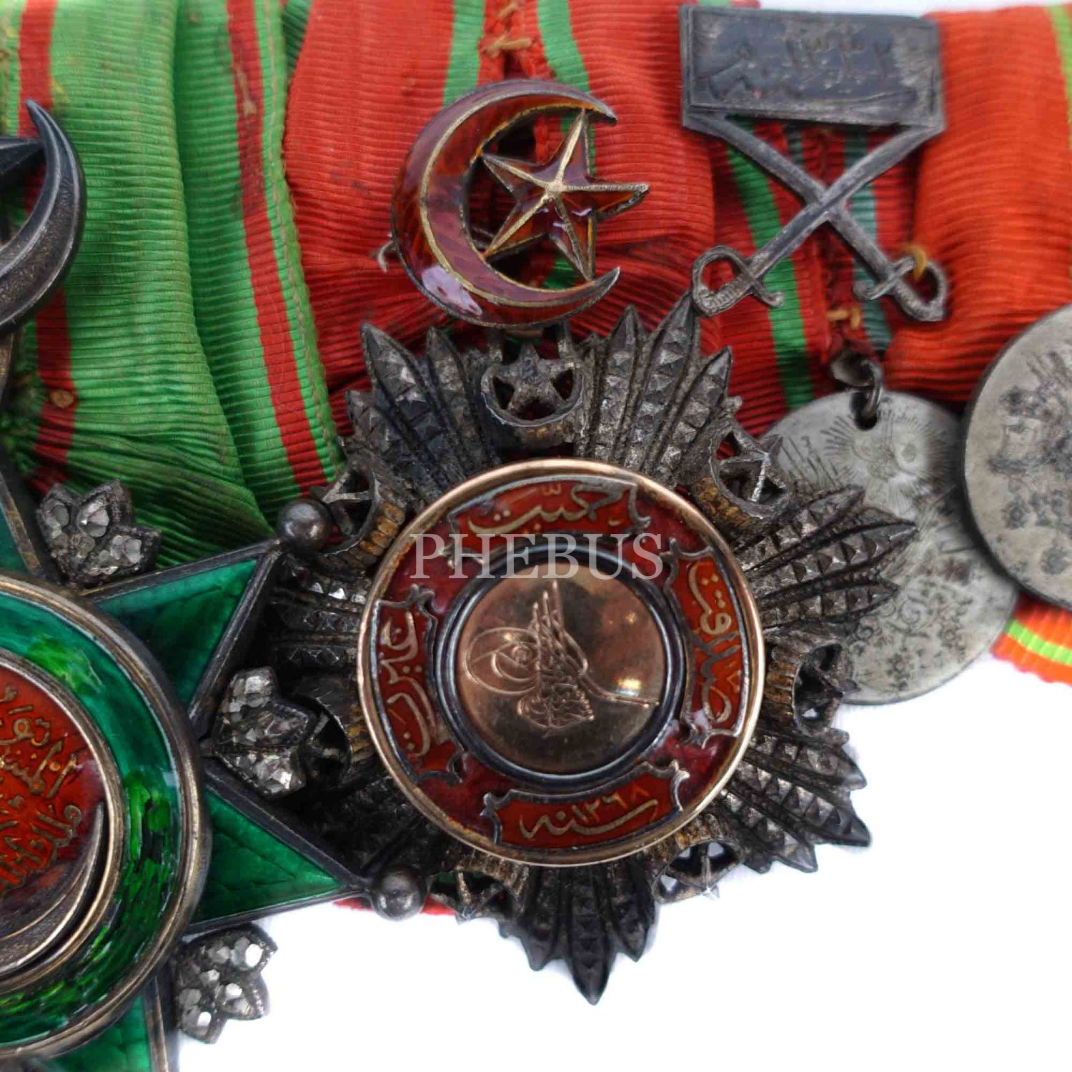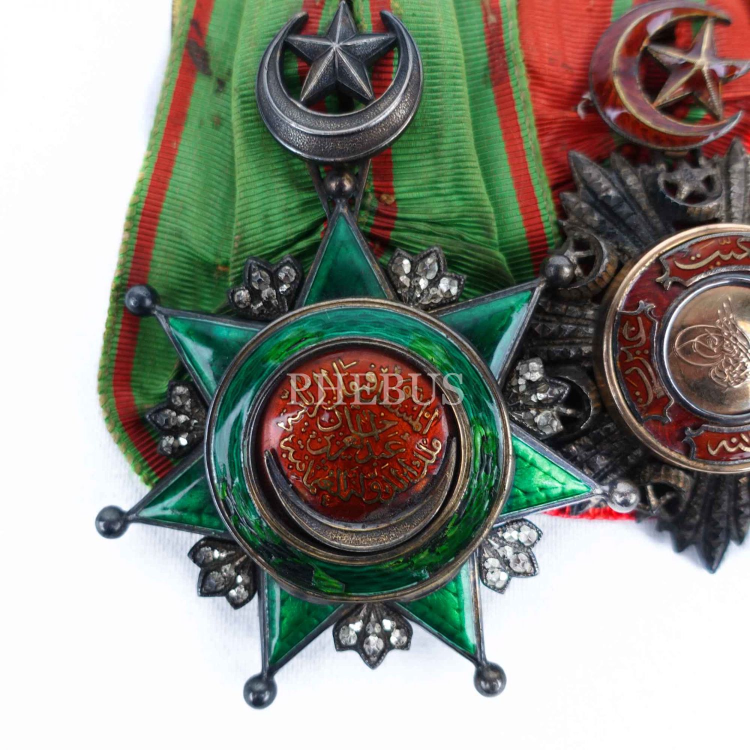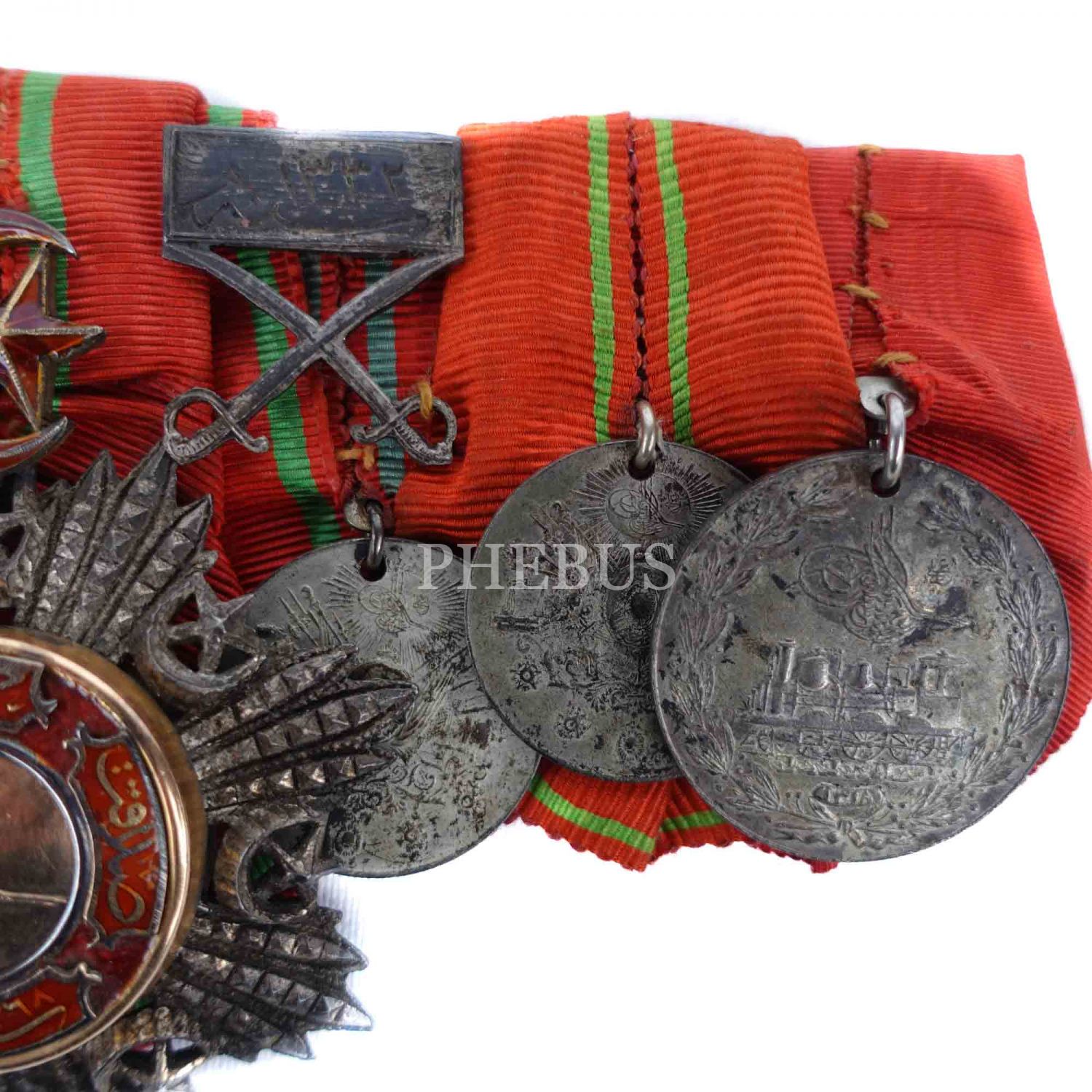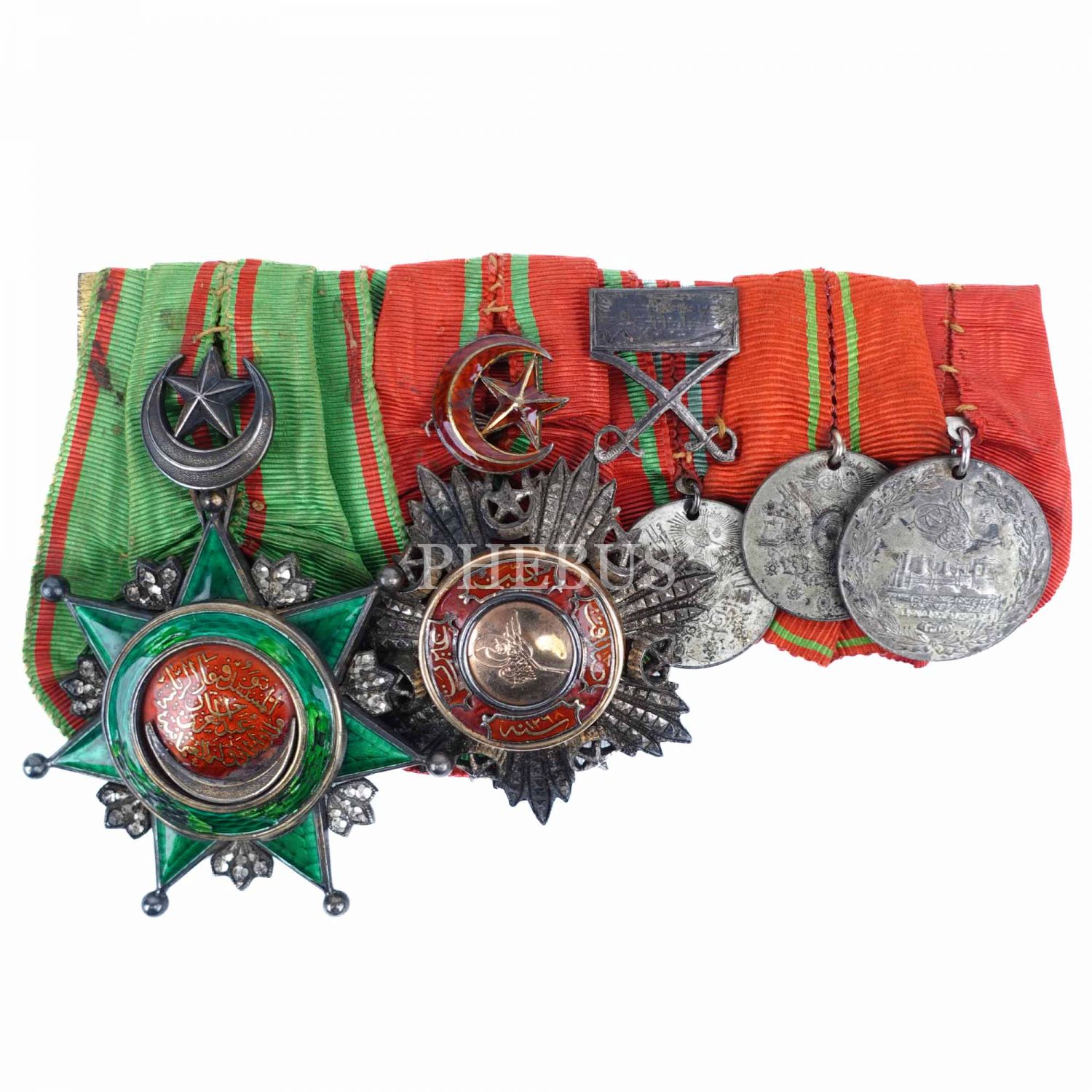 Beşli madalya barı: 1) Nişan-i Osmani 2) Mecidi Nişanı 3) Kılıçlı Liyakat Madalyası 4) Liyakat Madalyası 5) Hamidiye Hicaz Demiryolu Madalyası...