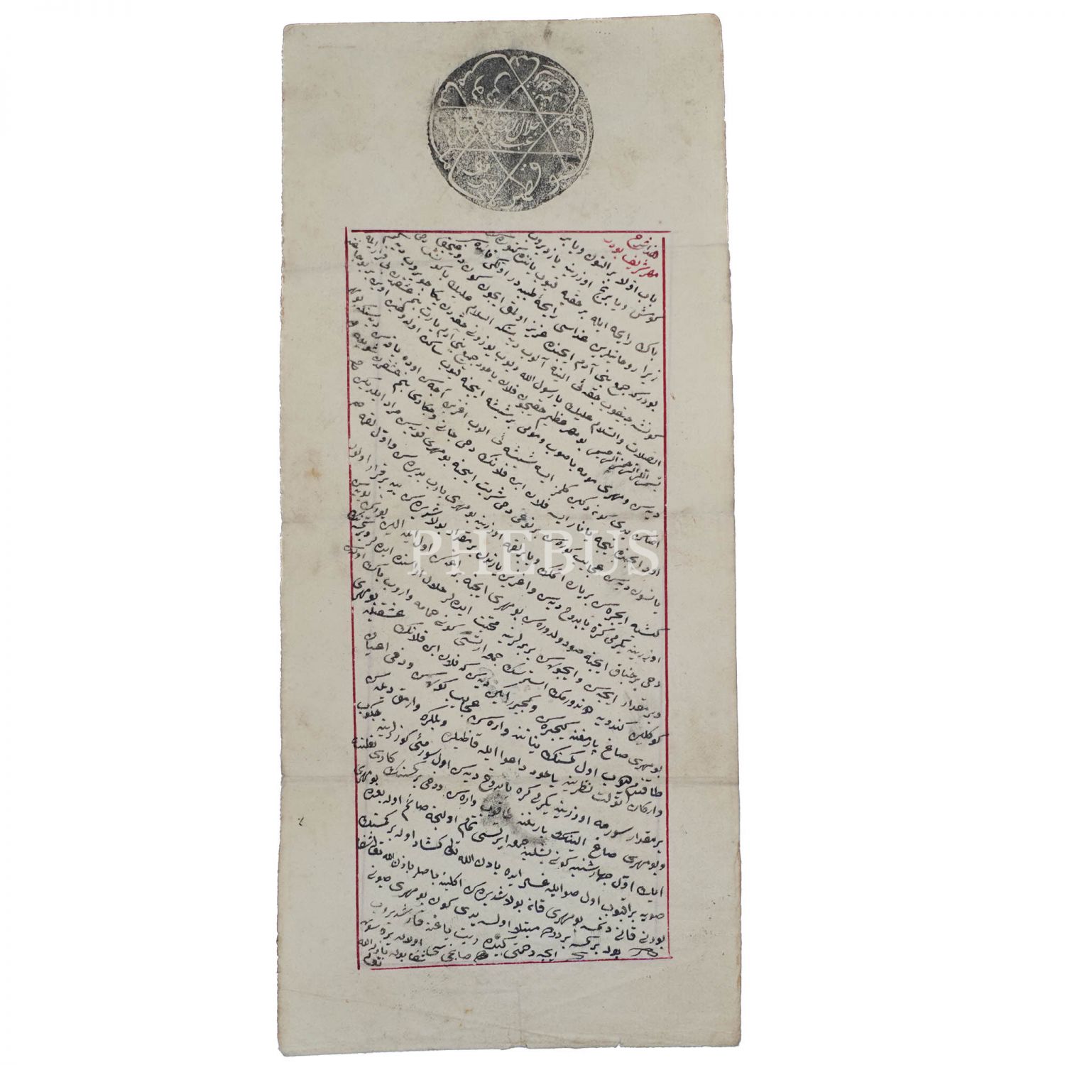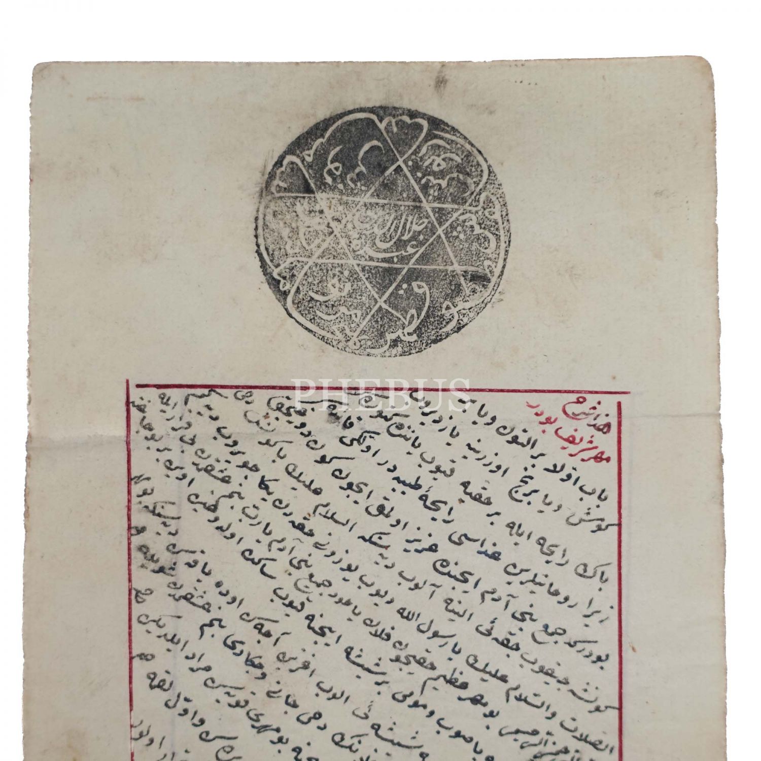 Ashab-ı Kehf´in isimleriyle yapılmış şifa mührü, altında mührün şifa için nasıl kullanılacağına dair metin, 23x10 cm...