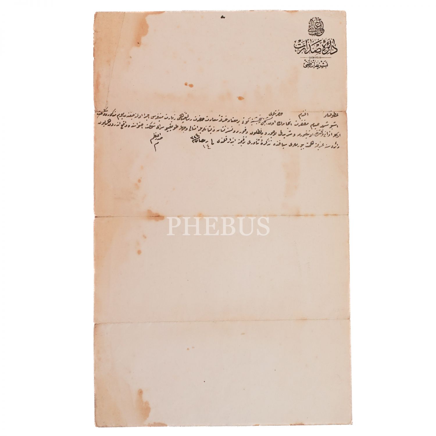 Daire-i Sadaret Teşrifat Kalemi antetli ve metnin taslak kısmı baskı tarih-gün-saat kısımları elle yazılmış, sadaretten padişaha gönderilmiş arz yazısıdır.