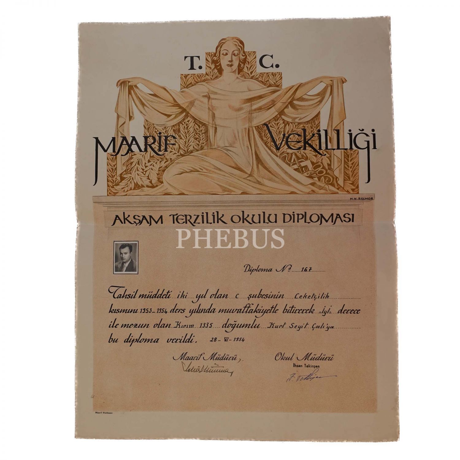 "Ceketçilik kısmı" - T.C. Maarif Vekilliği tarafından Kurt Seyit Çalı adına verilmiş Akşam Terzilik Okulu Diploması (tasarım: Mazhar Nazım Resmor), 1953-1954 ders yılı, Maarif Müdürü ile Okul Müdürünün ıslak imzalarıyla, Maarif Matbaası, 43x58 cm...