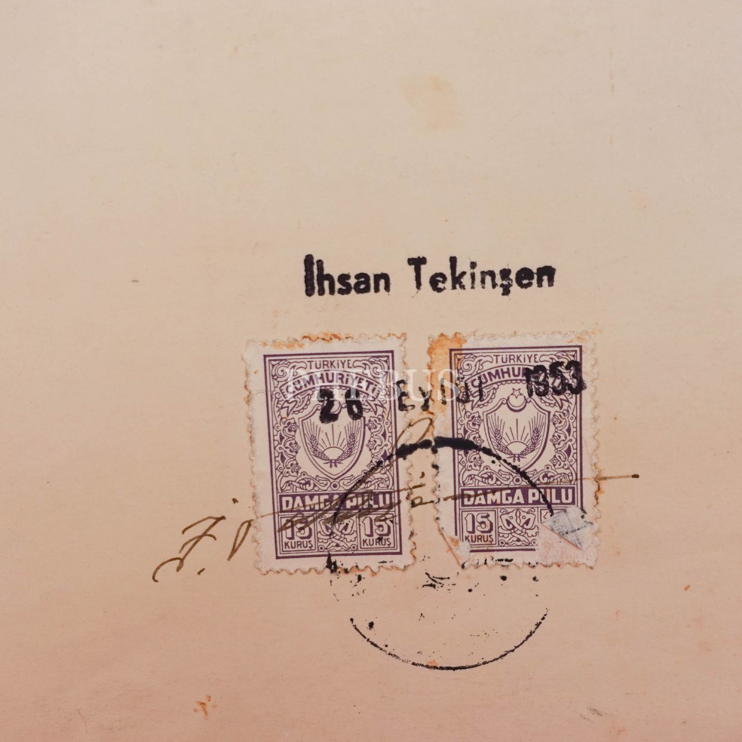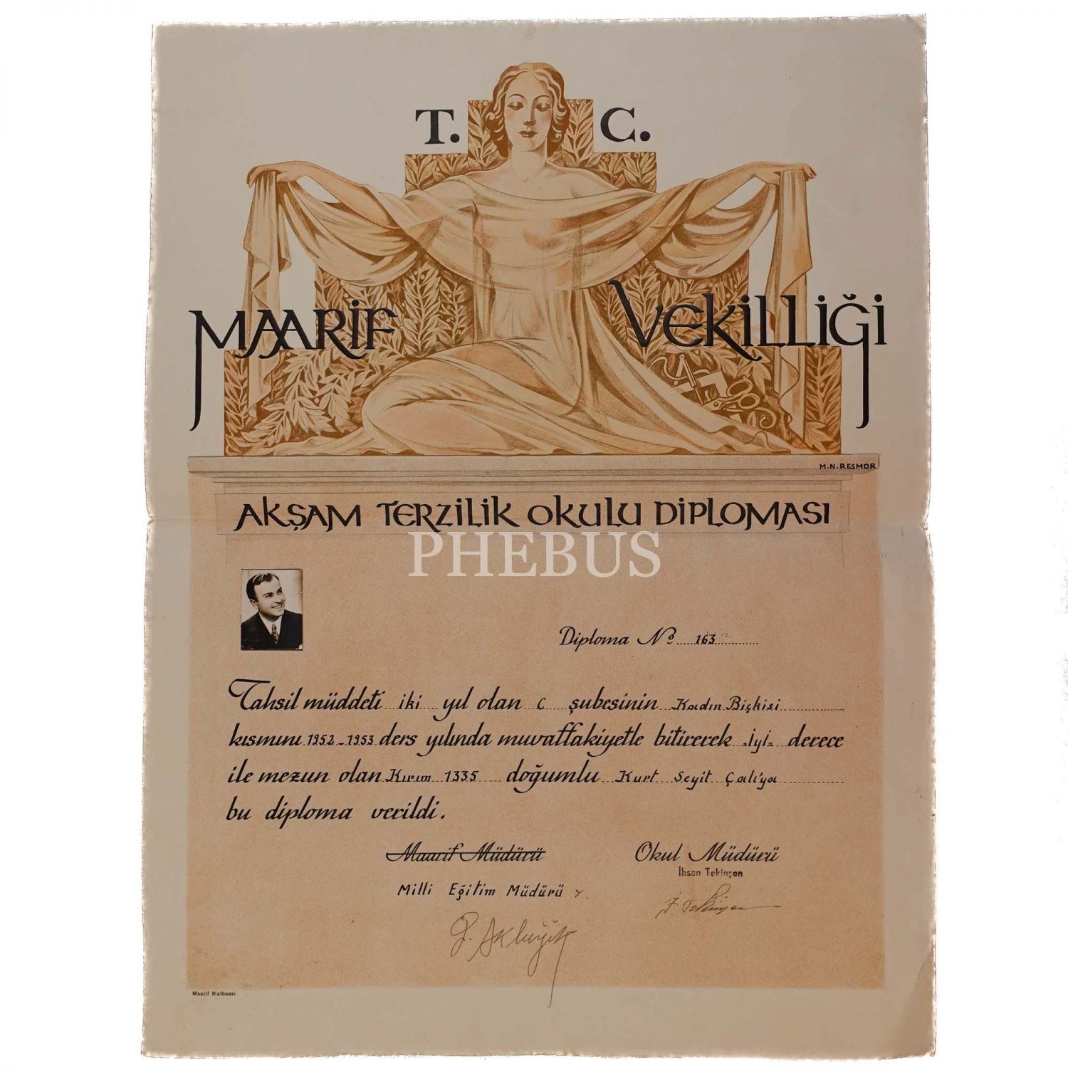 "Kadın Biçkisi kısmı" - T.C. Maarif Vekilliği tarafından Kurt Seyit Çalı adına verilmiş Akşam Terzilik Okulu Diploması (tasarım: Mazhar Nazım Resmor), 1952-1953 ders yılı, Maarif Müdürü ile Okul Müdürünün ıslak imzalarıyla, Maarif Matbaası, 43x58 cm...