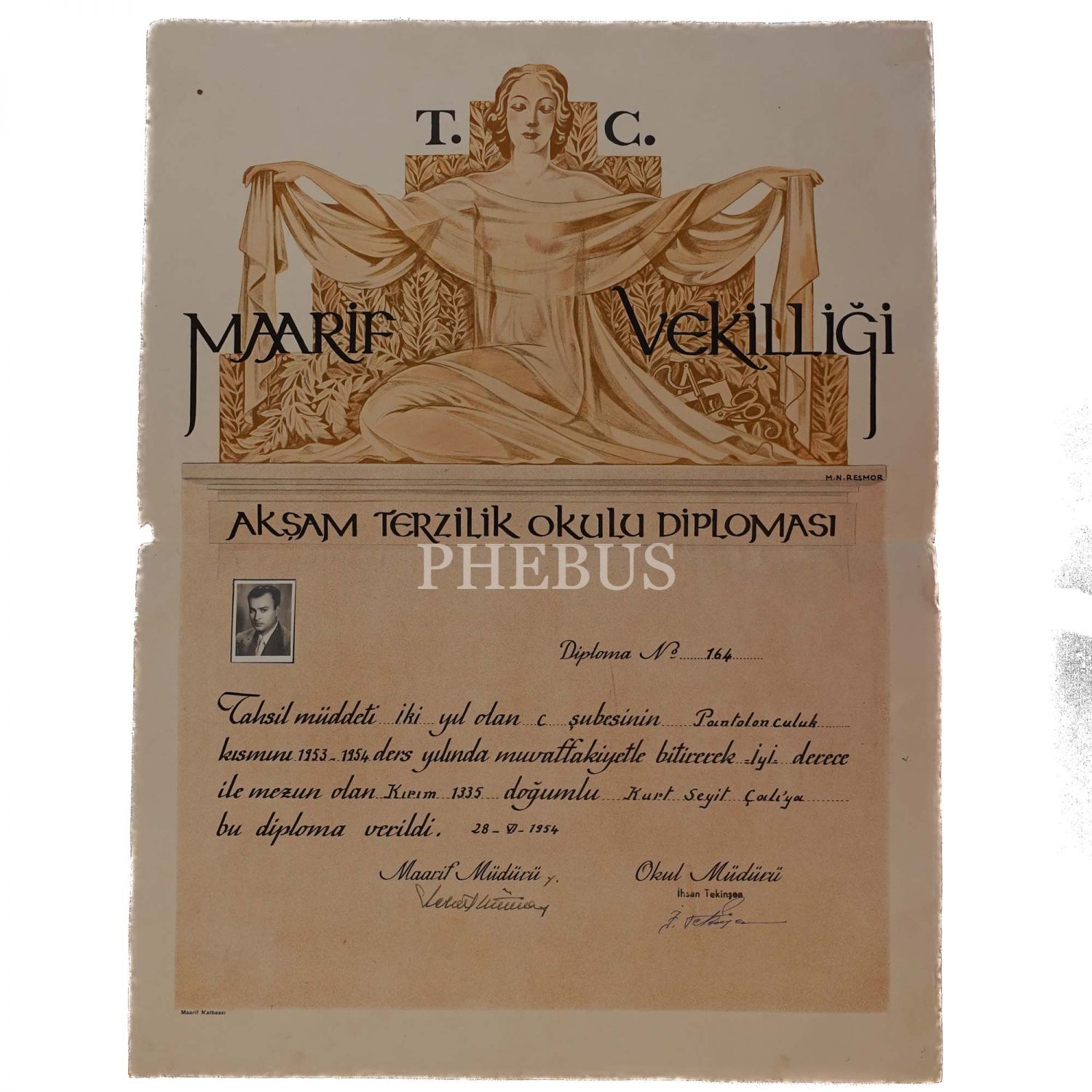 "Pantolonculuk kısmı" - T.C. Maarif Vekilliği tarafından Kurt Seyit Çalı adına verilmiş Akşam Terzilik Okulu Diploması (tasarım: Mazhar Nazım Resmor), 1953-1954 ders yılı, Maarif Müdürü ile Okul Müdürünün ıslak imzalarıyla, Maarif Matbaası, 43x58 cm...