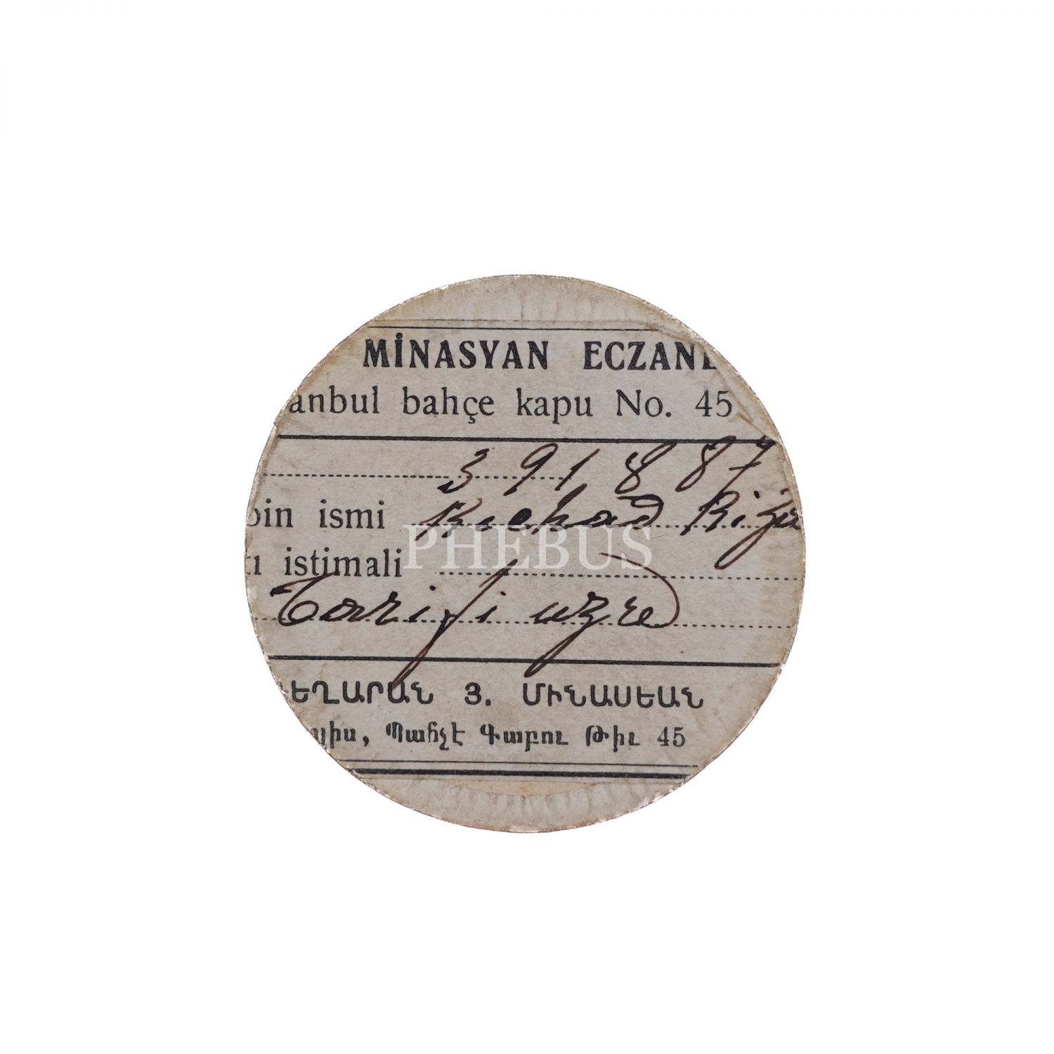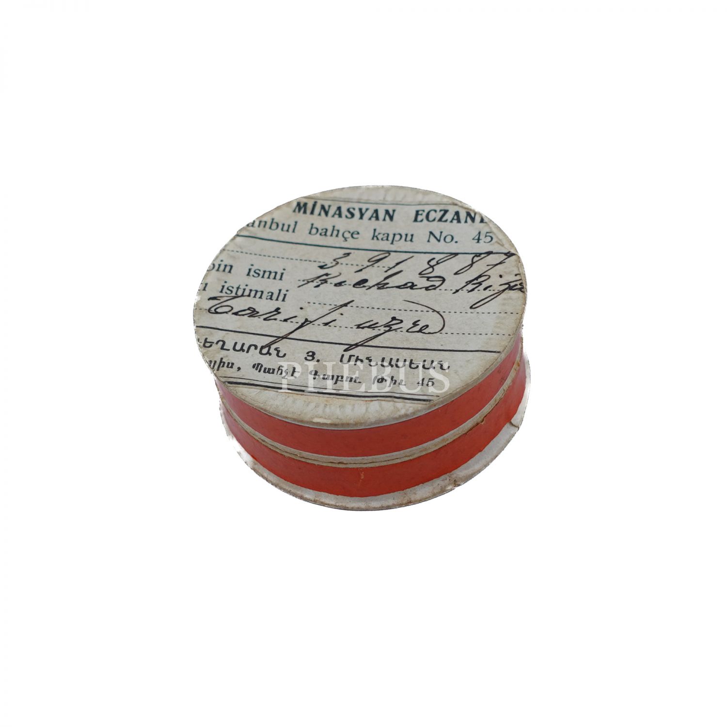 Türkçe-Ermenice "Minasyan Eczanesi (İstanbul Bahçe Kapu No. 45)" ibareli karton ilaç kutusu, 4,5x2 cm...