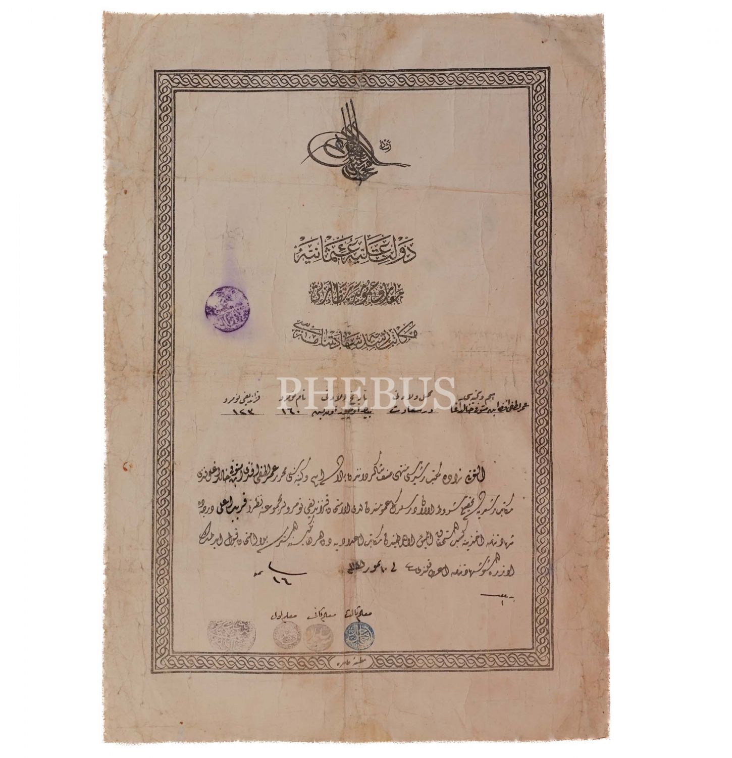 Sultan Mehmet Reşat tuğralı Mekteb-i Rüşdiye Şehadetnamesi, Halid Ağa´nın oğlu Ömer Lütfi Efendi´nin karib-i âlâ derece ile mezun olduğuna dair şehadetname, 37x25 cm...