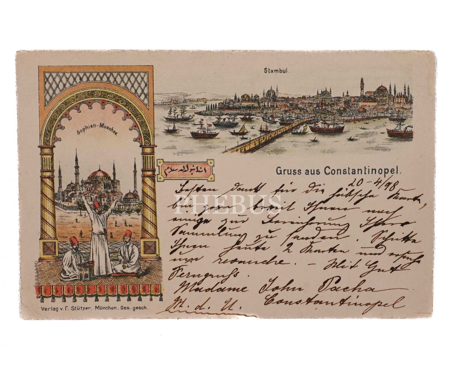 Ayasofya Camii, Mevlevi dervişler ve Sarayburnu-Haliç panoraması görselli parçalı İstanbul kartpostalı, "Gruss aus Constantinopel", ed. Verlag v. F. Stützer, München, 14x9 cm...