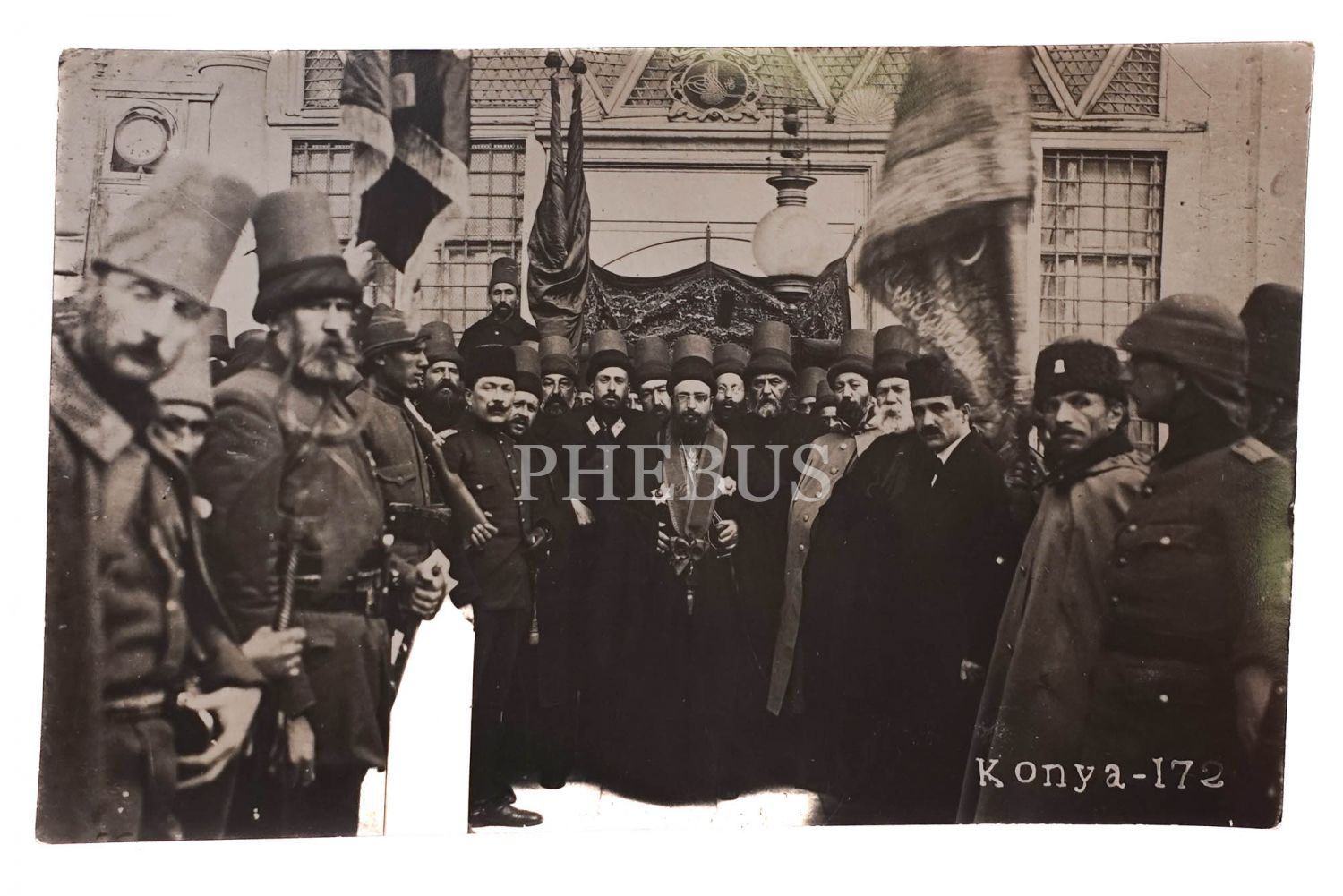 Cihan Harbi yıllarında Mevlevilerin desteğini almak maksadıyla Sultan V. Mehmed Reşad tarafından kurulan "Mücahidin-i Mevleviye Alayı" ve kumandanı Veled Çelebi (İzbudak) sancağı teslim alırken, Konya, 8x4 cm...